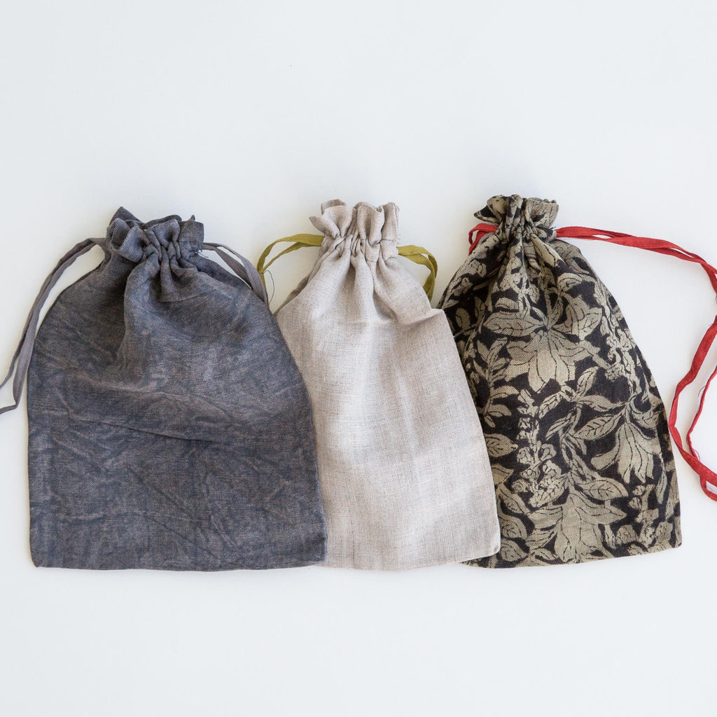 Set of 3 bags at a discount. These naturally dyed drawstring bags are made with a variety of Maiwa's beautiful fabrics. They are great for carrying your essentials and perfect for gift giving.
