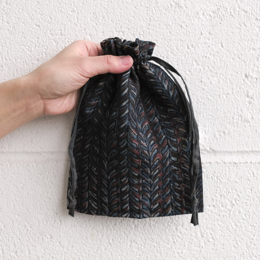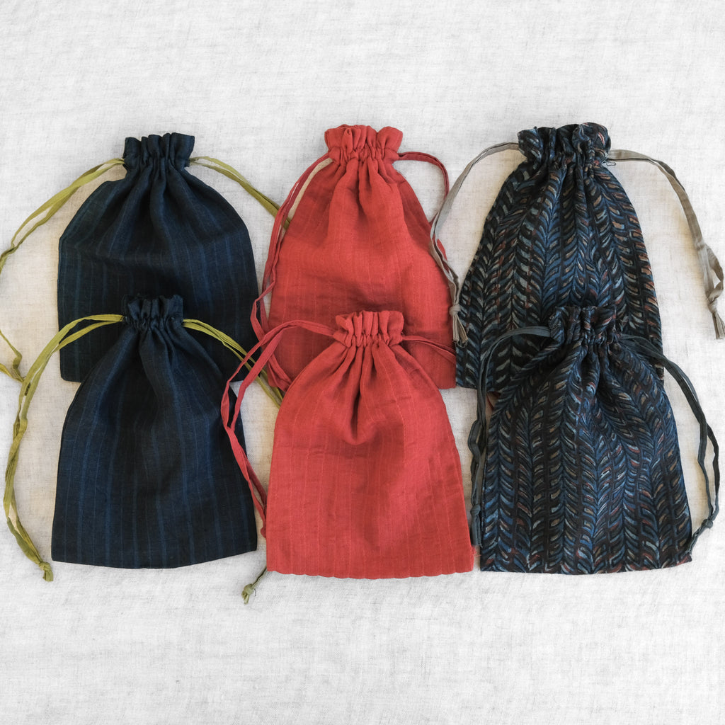 Set of 6 bags at a discount. These naturally dyed drawstring bags are made with a variety of Maiwa's beautiful fabrics. They are great for carrying your essentials and perfect for gift giving.