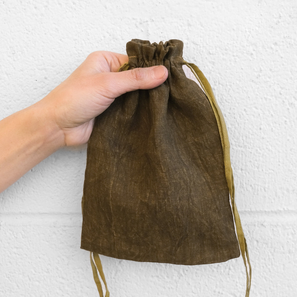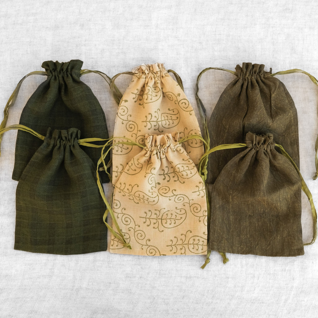 Set of 6 bags at a discount. These naturally dyed drawstring bags are made with a variety of Maiwa's beautiful fabrics. They are great for carrying your essentials and perfect for gift giving.