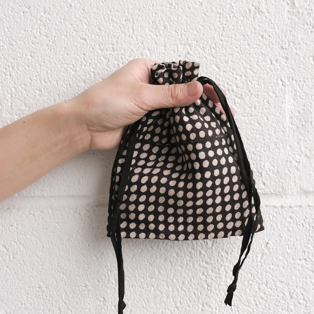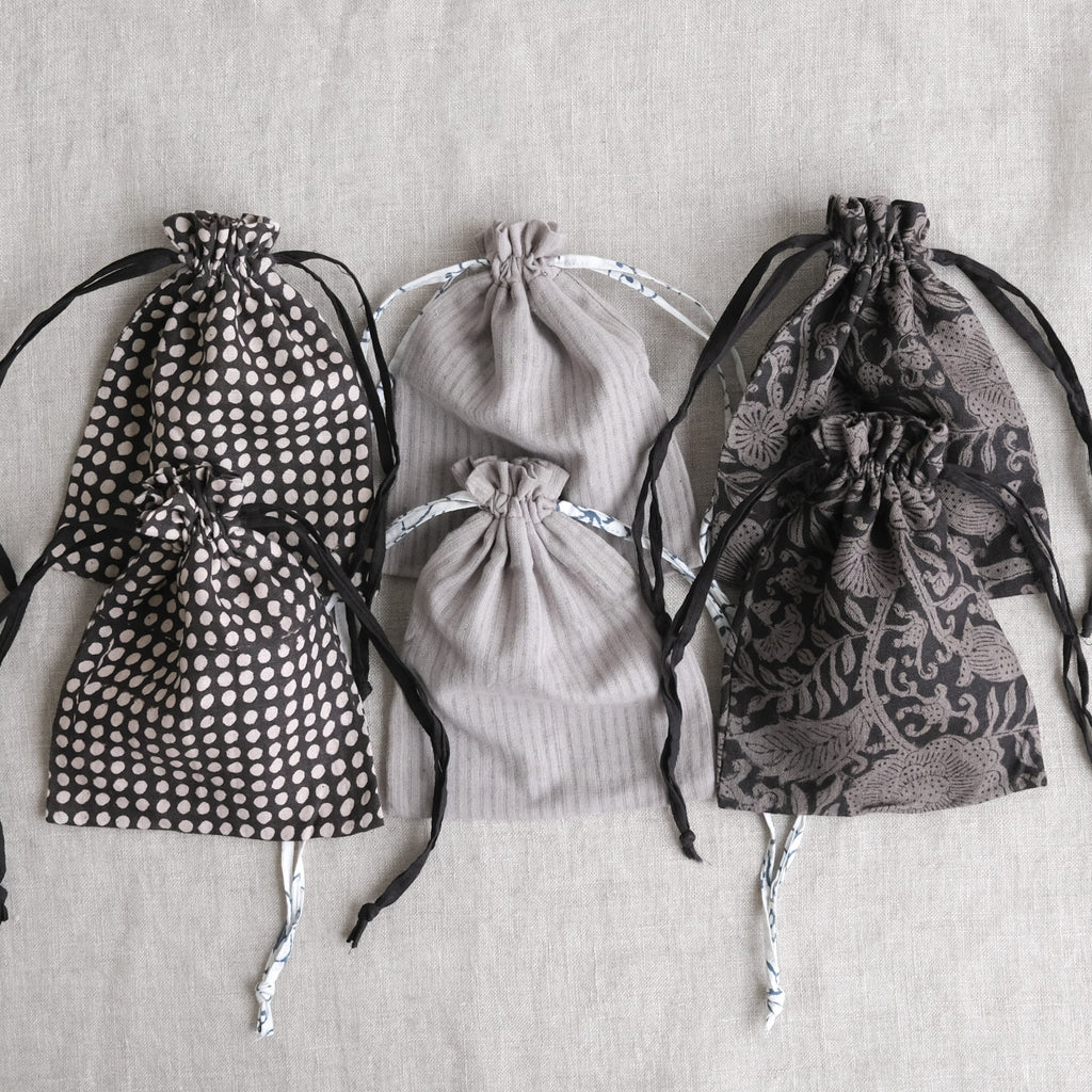 Set of 6 bags at a discount. These naturally dyed drawstring bags are made with a variety of Maiwa's beautiful fabrics. They are great for carrying your essentials and perfect for gift giving.