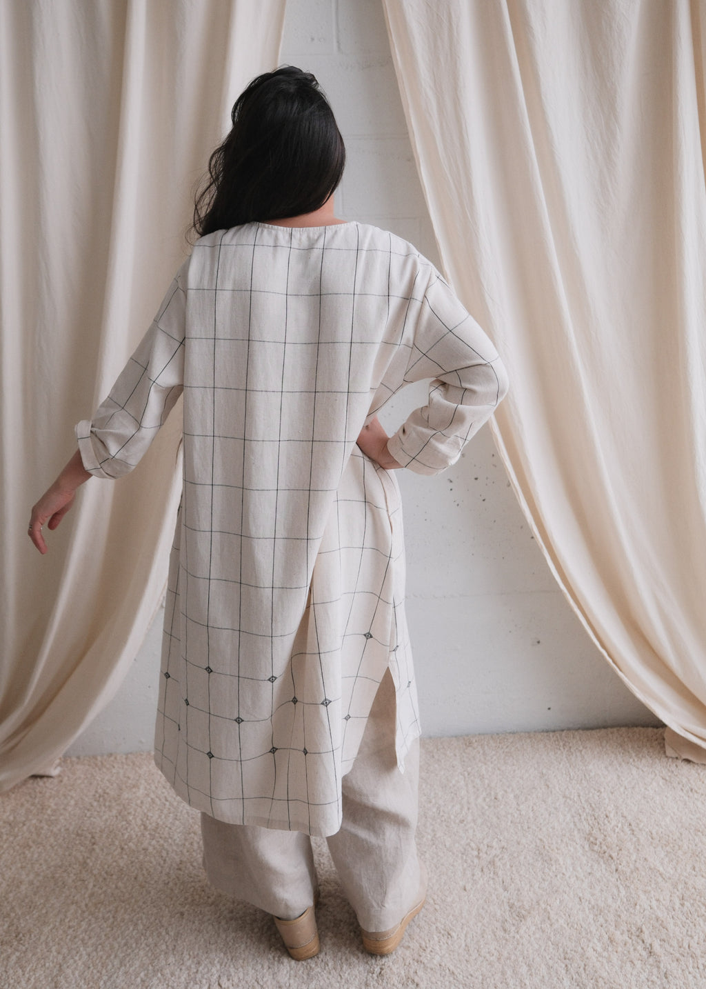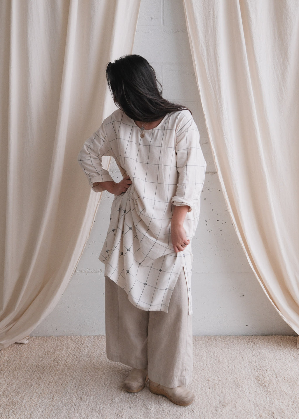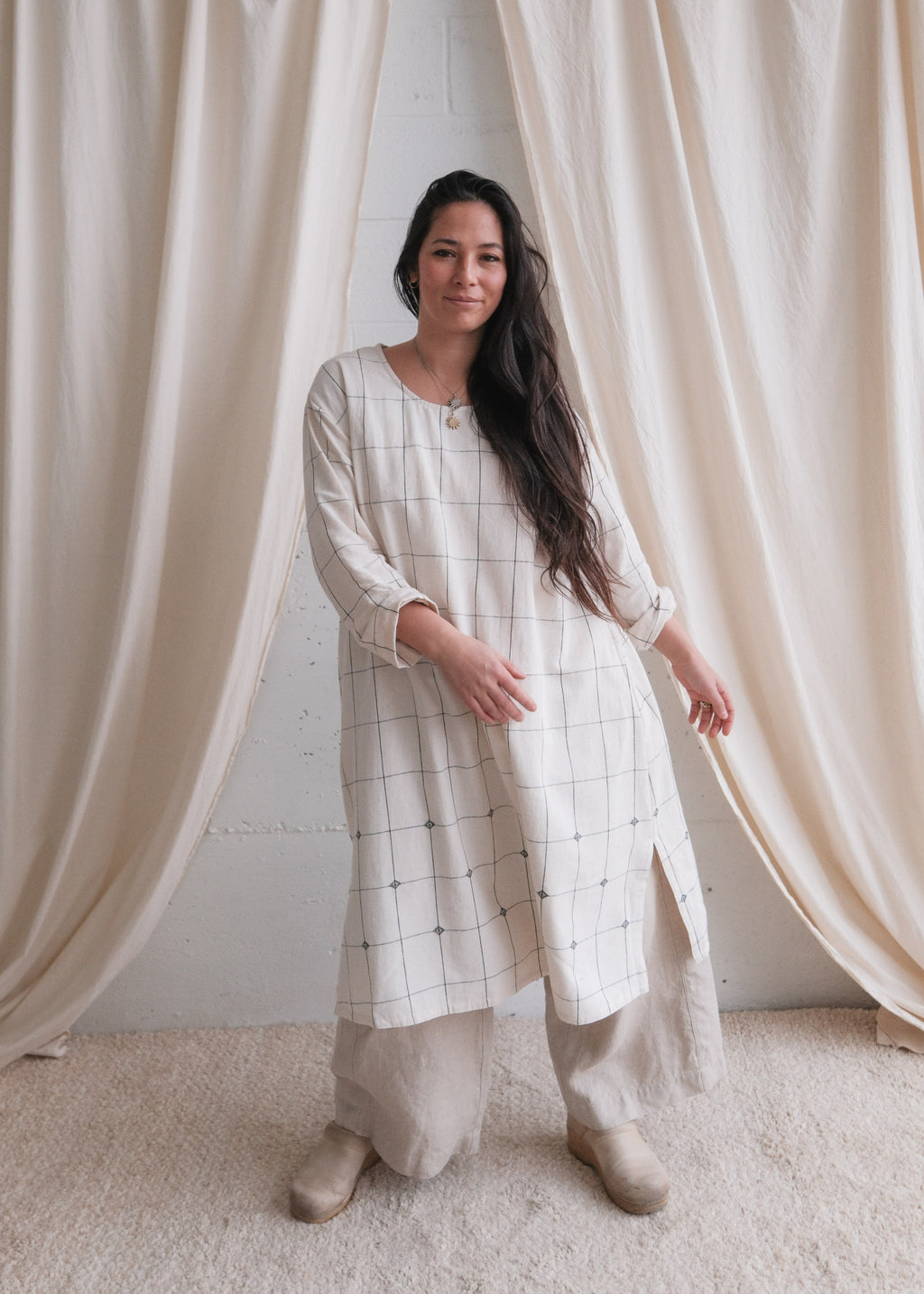 A long sleeve tunic dress with a soft, effortless silhouette accentuating the beautiful drape of kala cotton. This piece can be worn on its own or layered over top of a pant or skirt.
