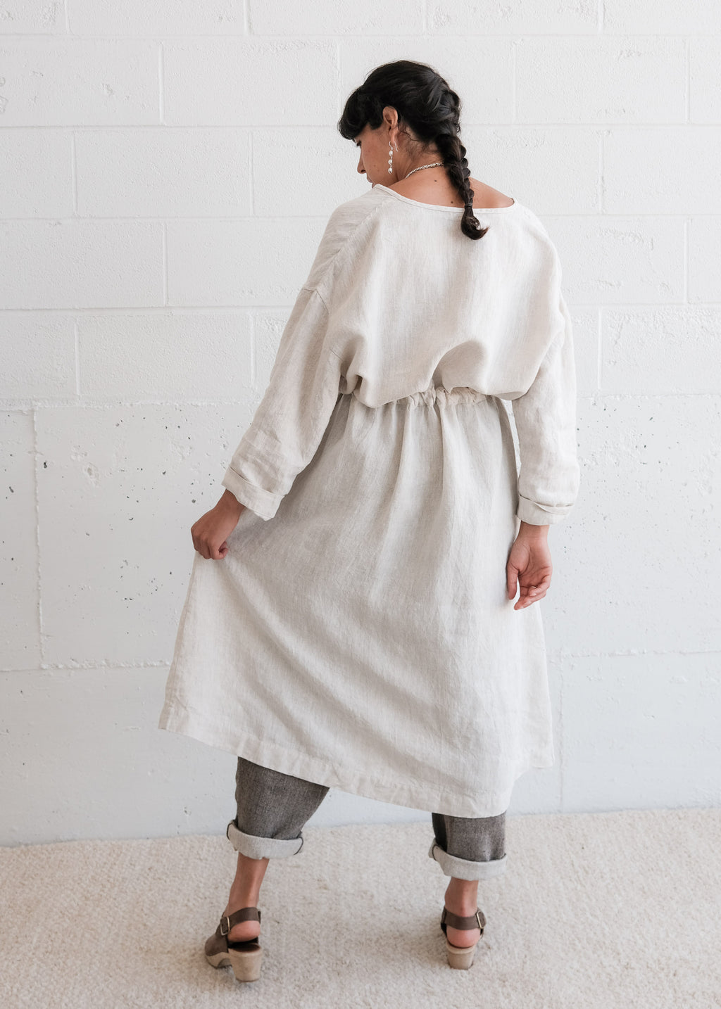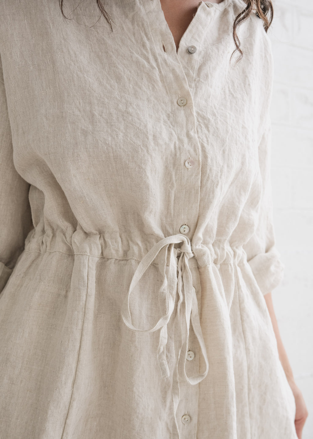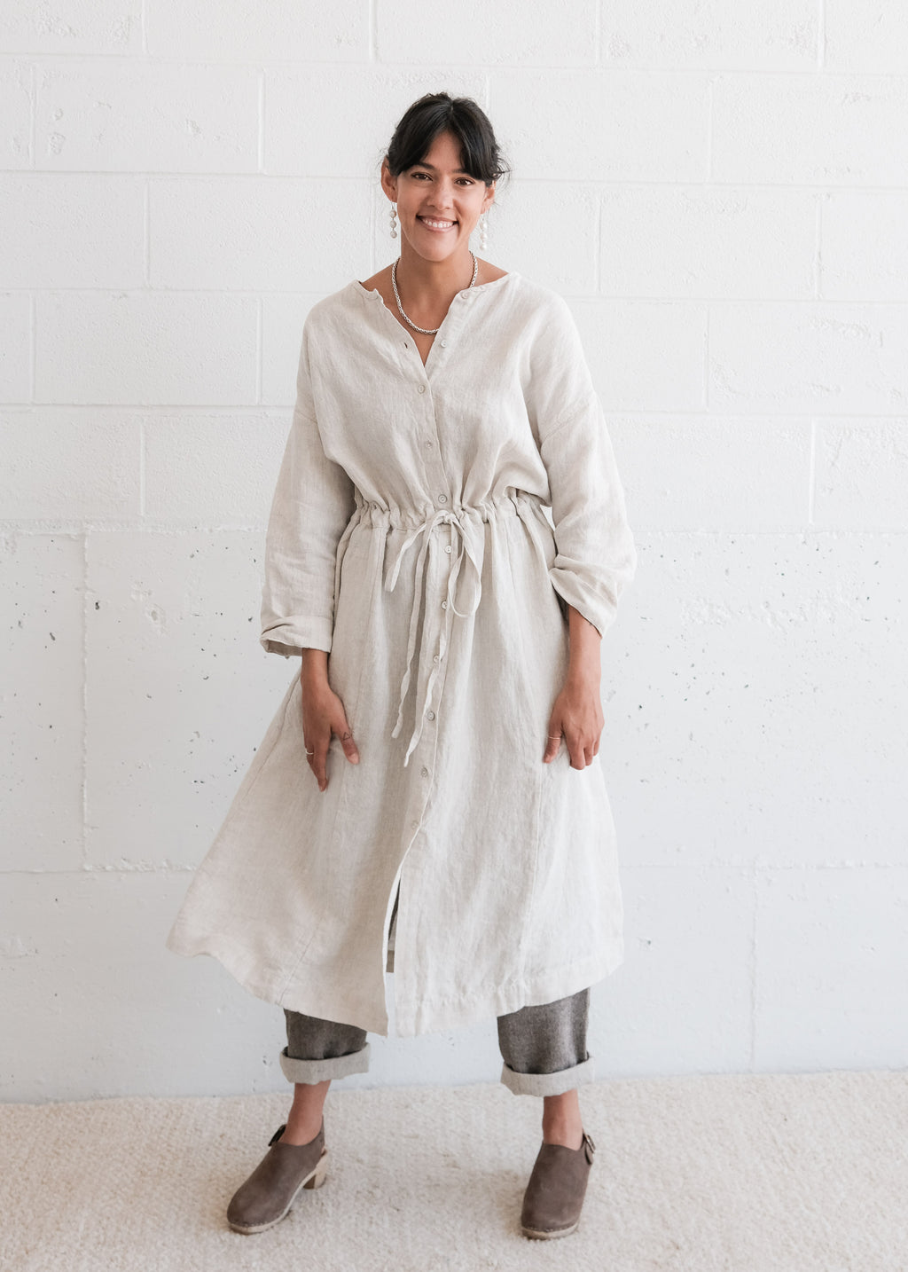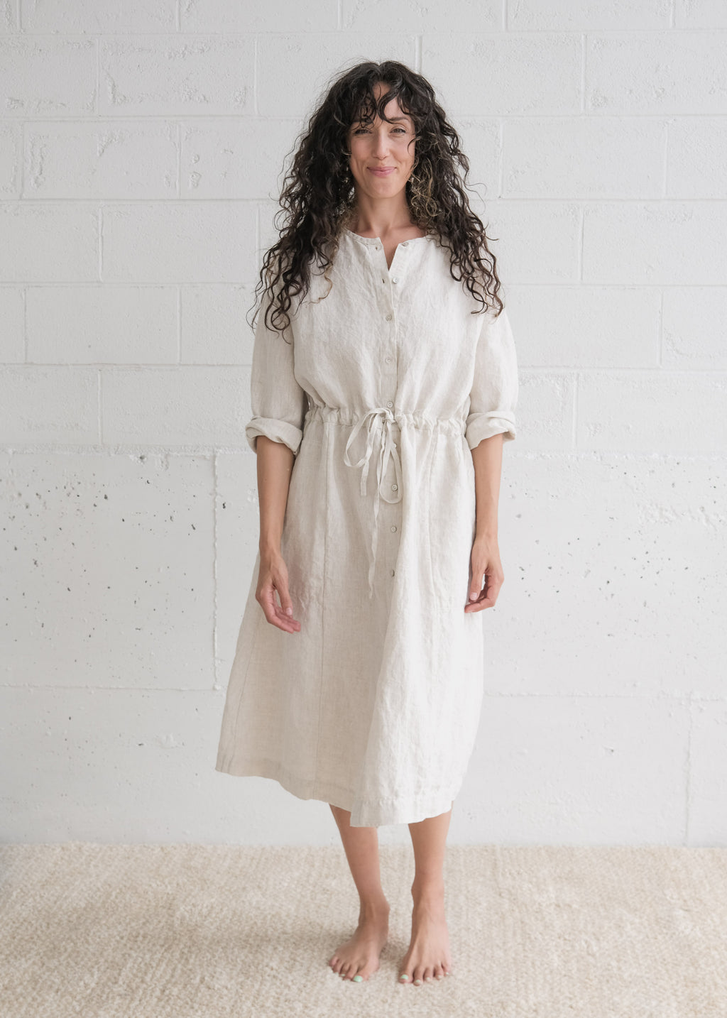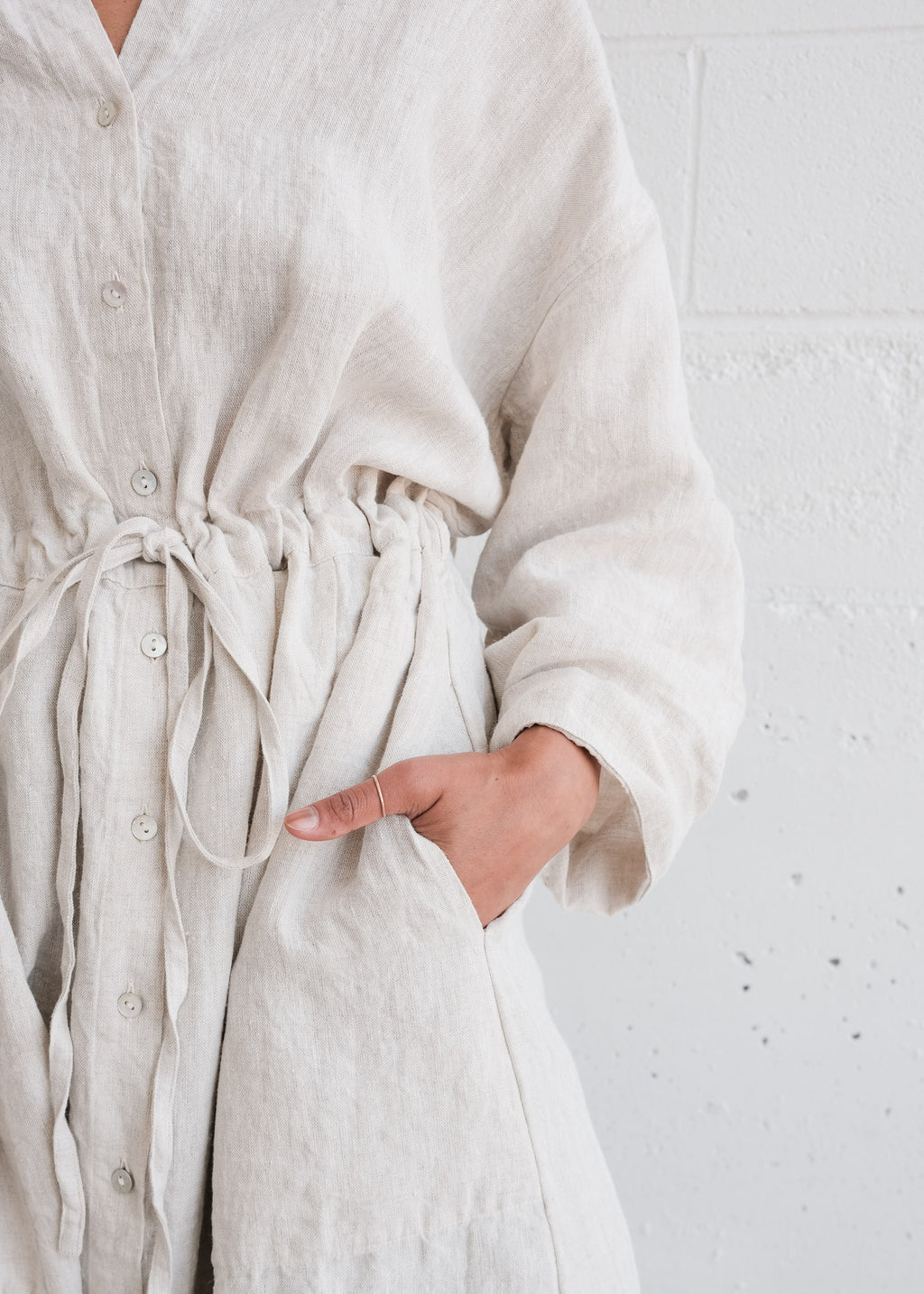 A dress you'll want to live in! Easy to wear and versatile - can be cinched at the waist, buttoned fully, worn open, or styled by increasing the length of the slit.