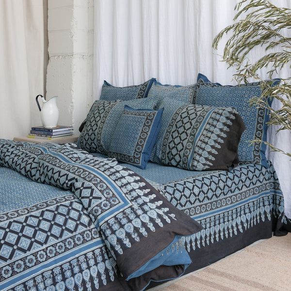 Organic cotton duvets that have been hand block printed with natural dyes. We feature four traditional block printing techniques: Ajrakh, Dabu, Kalamkari, and Bagh. For centuries, wooden blocks have been used to print eloquent geometric patterns on cotton. These patterns are timeless, revealing a remarkable play between figure and line. Crawl into cozy artisan crafted organic cotton bedding today!