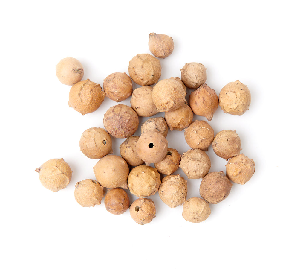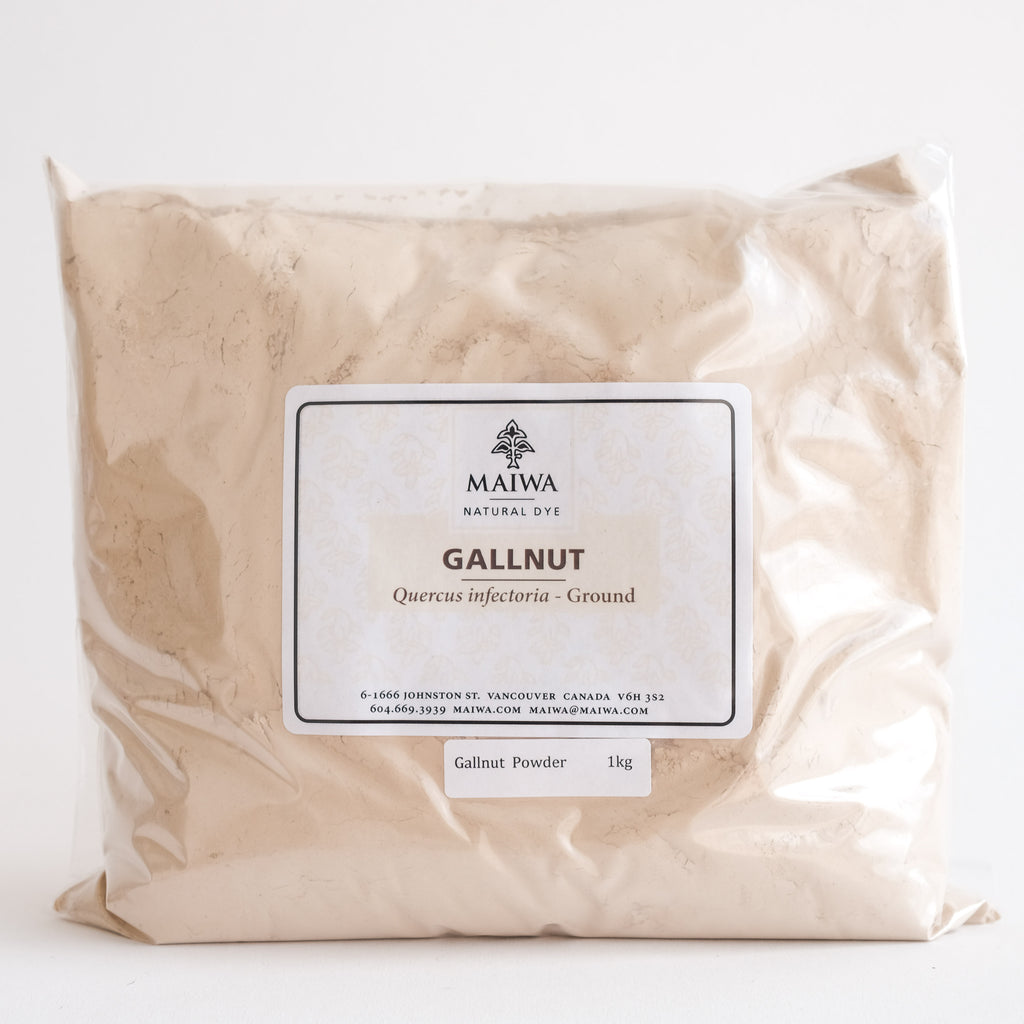 Gallnut (quercus infectoria) powder. Gallnut is one the earliest and richest source for natural colourless tannin and is found in the galls of oak trees. These galls are produced by insects who deposit their eggs in small punctures they make on young branches. The tree excretes a tannin rich substance that hardens to form a gallnut. These are collected and ground for use as a tannin mordant for cellulose fibres, in the leather tanning industry, and for medicine. Mordant using 10%-15% WOF.