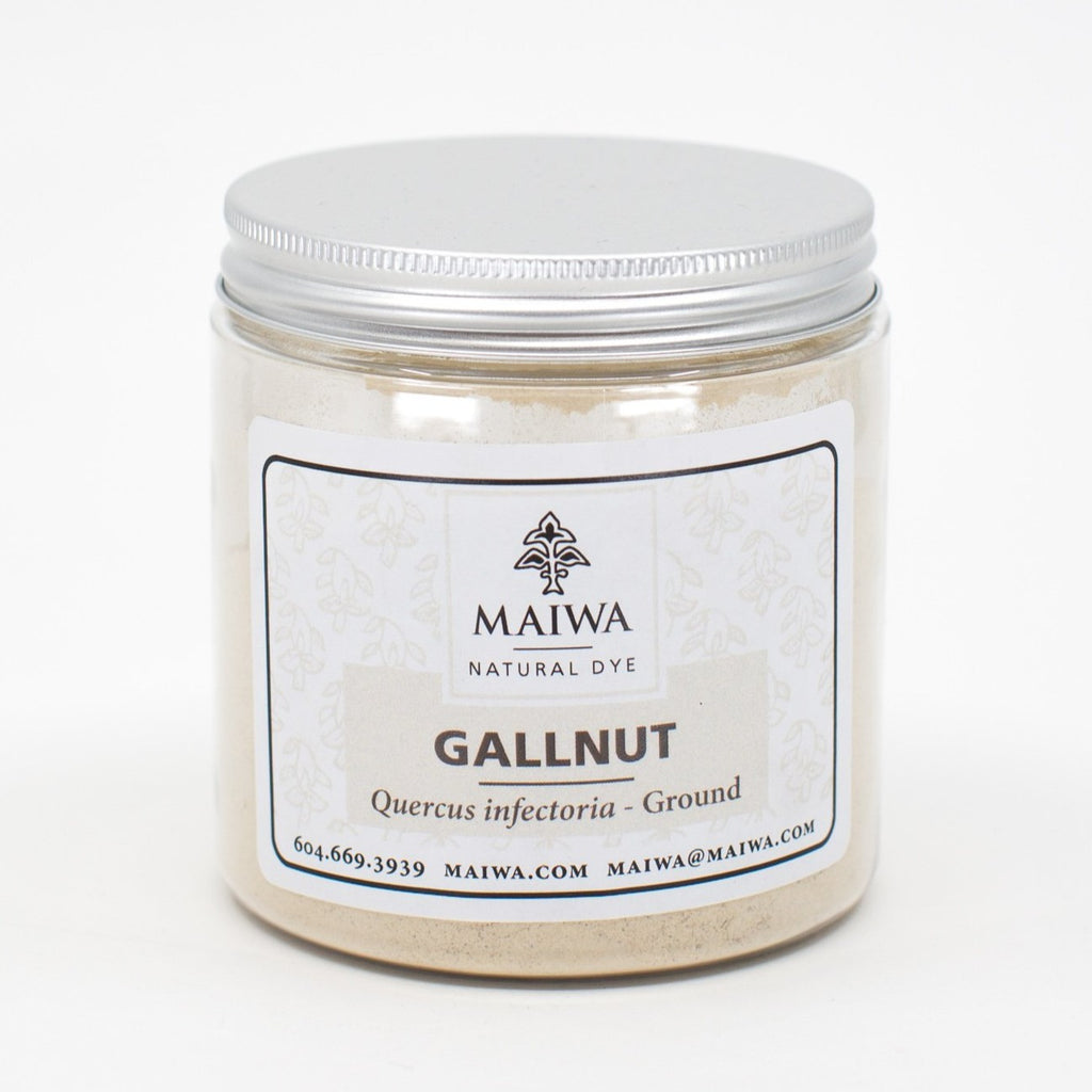 Gallnut (quercus infectoria) powder. Gallnut is one the earliest and richest source for natural colourless tannin and is found in the galls of oak trees. These galls are produced by insects who deposit their eggs in small punctures they make on young branches. The tree excretes a tannin rich substance that hardens to form a gallnut. These are collected and ground for use as a tannin mordant for cellulose fibres, in the leather tanning industry, and for medicine. Mordant using 10%-15% WOF.