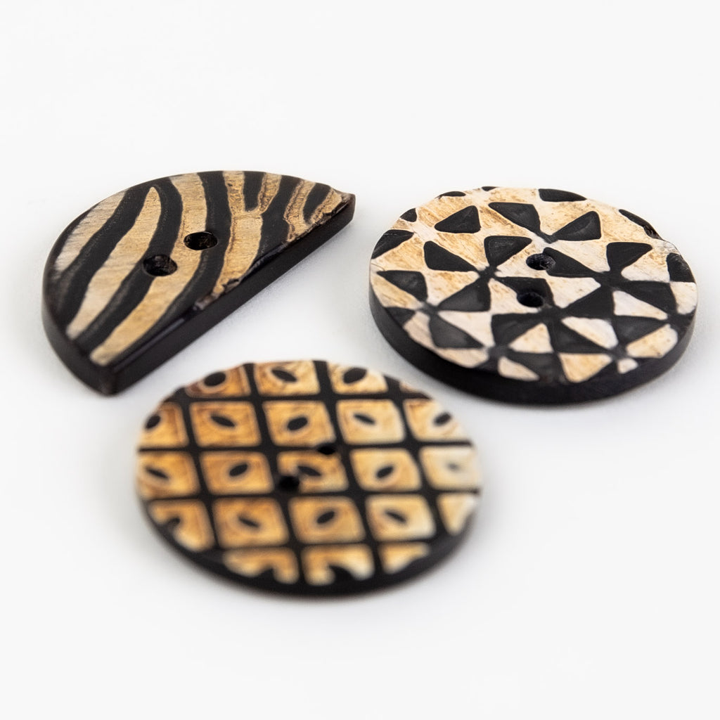 Set of 3 buttons at a discount. Handcarved by Nepalese artisans. Maiwa has worked with this group of craftspeople for over twenty years. Items carved from horn or bone are all obtained from animals that have died of natural causes. Each unique design beautifully captures the character of the carvers.