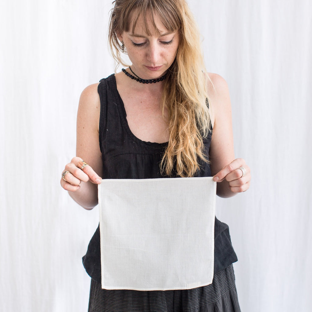 A pack of 12 organic lightweight cotton handkerchiefs, great for dyeing and surface design projects. The hem is sewn with a cotton thread making it ideal for indigo and other natural dyes.