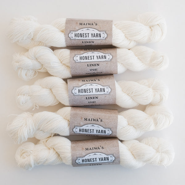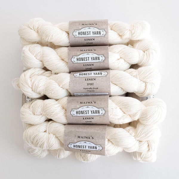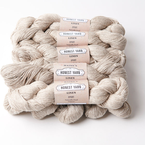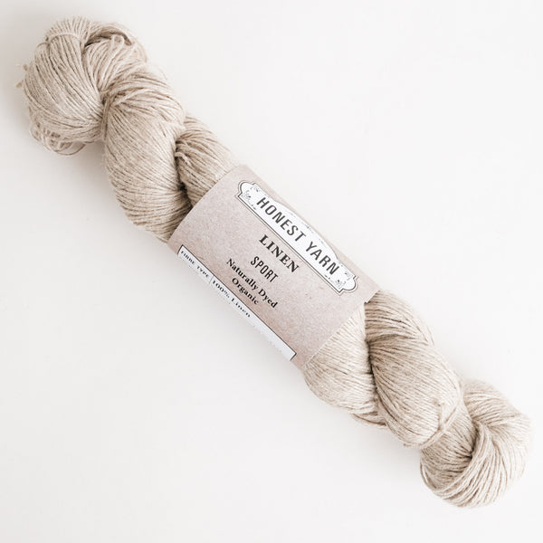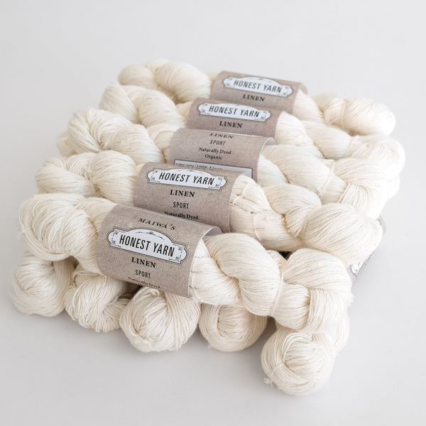 Our Linen Honest Yarn shows the raw beauty of Belgian flax, spun in Bengal. It offers a wonderful buttery hand and the exceptional weight and presence that only linen can give. Available in skeins (LACE, FINGERING & SPORT) and cones (COBWEB).