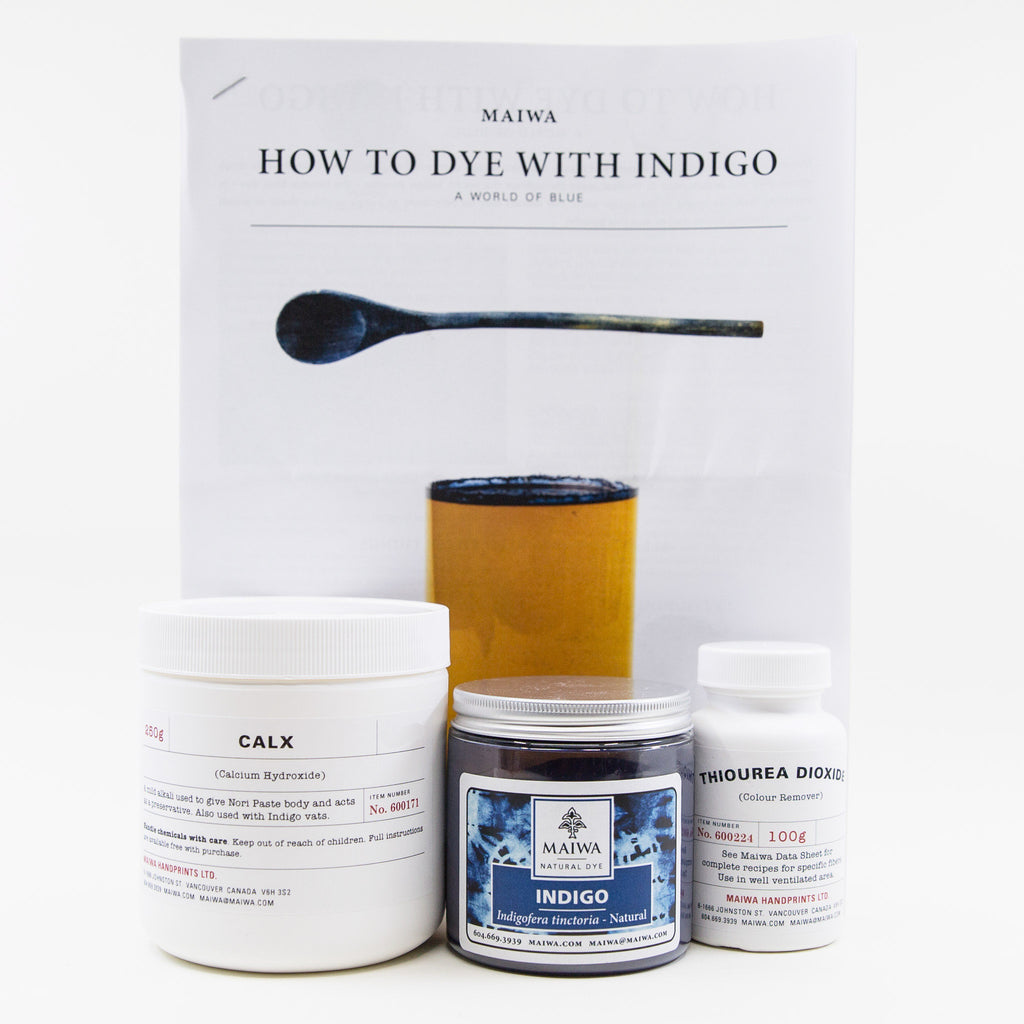 This kit contains 100g natural indigo, 100g thiourea dioxide, 250g Calcium hydroxide, instructions.