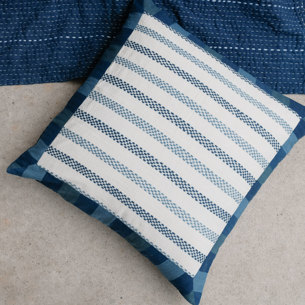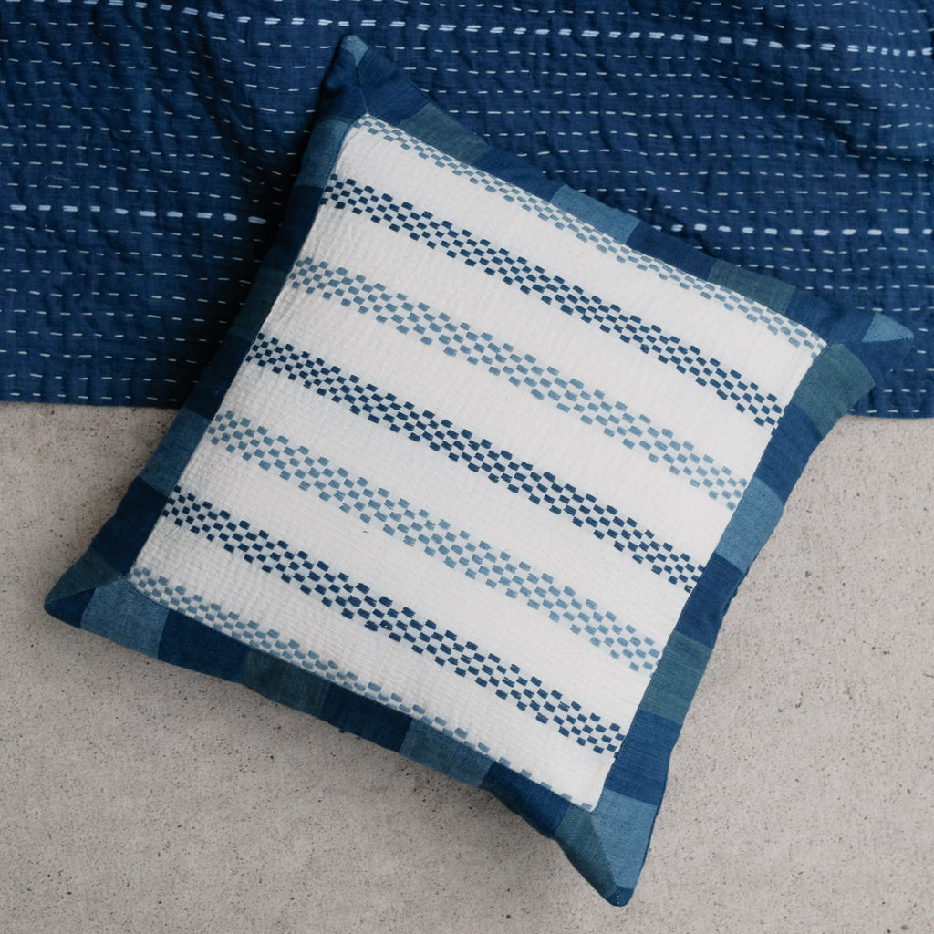 An exceptional handstitched cushion cover to adorn a special spot in your home. Made of artisan cloth - where threads were first dyed in natural fermentation indigo vats, then handwoven by skilled weavers. Finally, each piece has been adorned with handstitching in Sundarbans, India. Each piece is unique and has a story to tell.