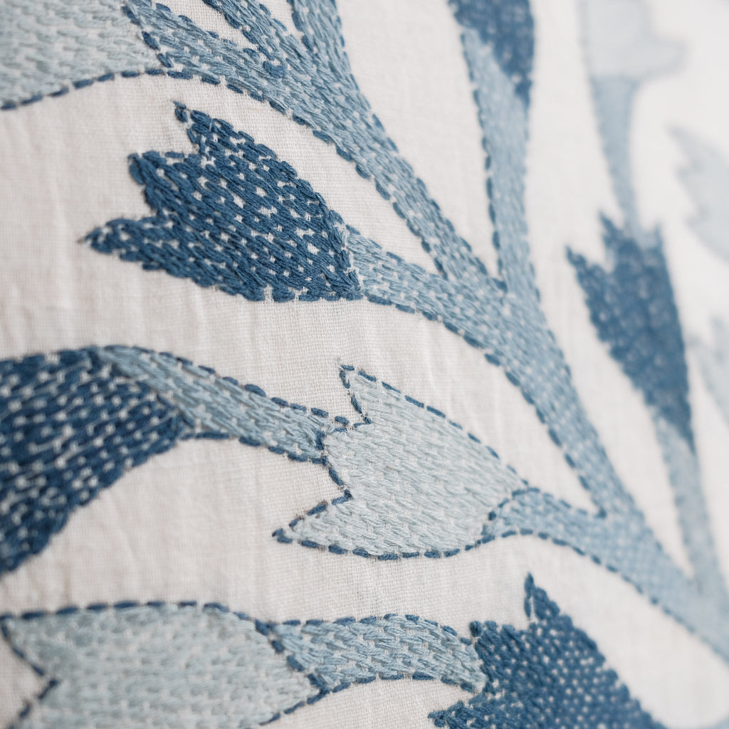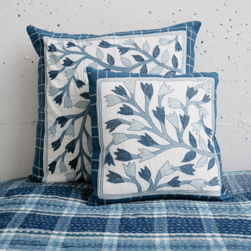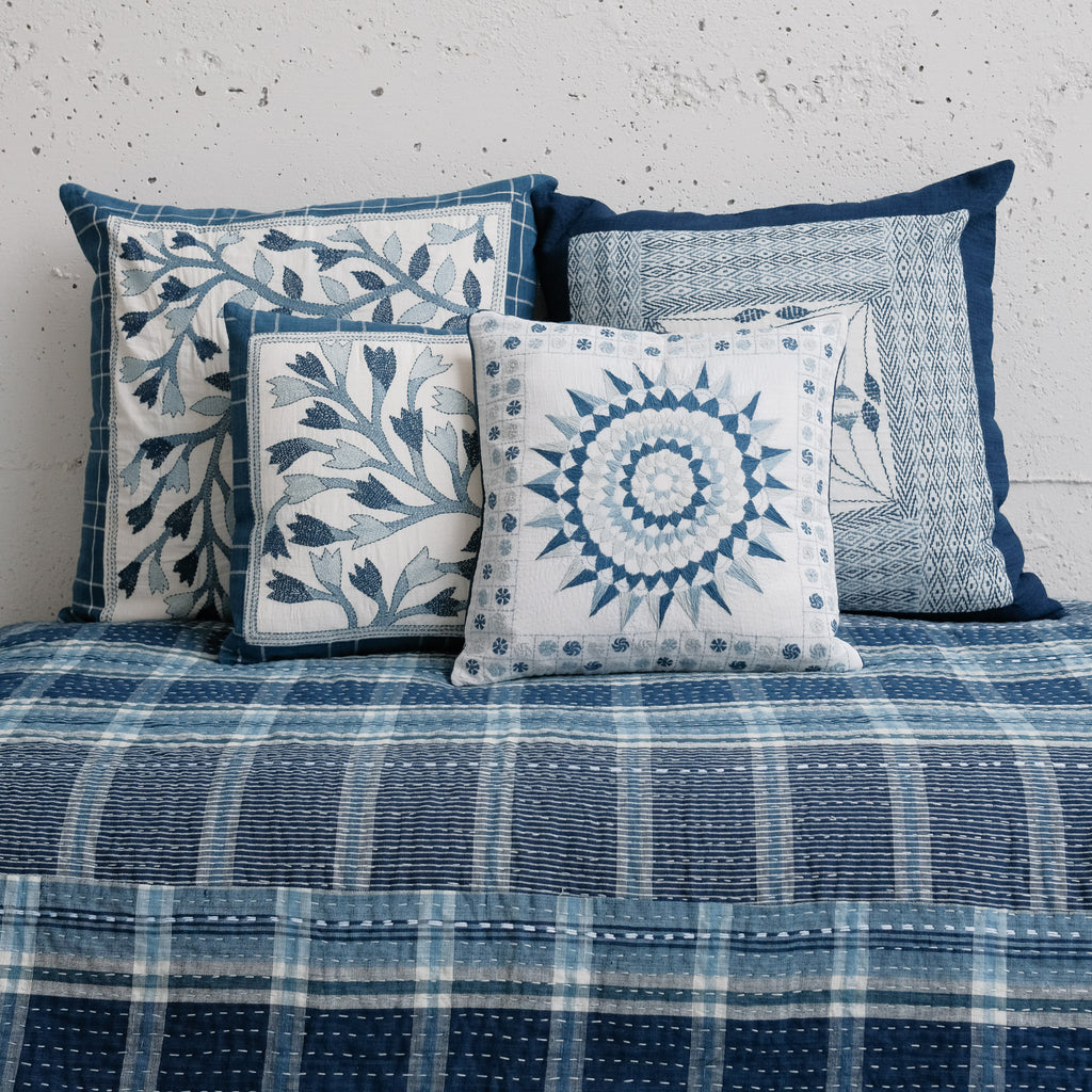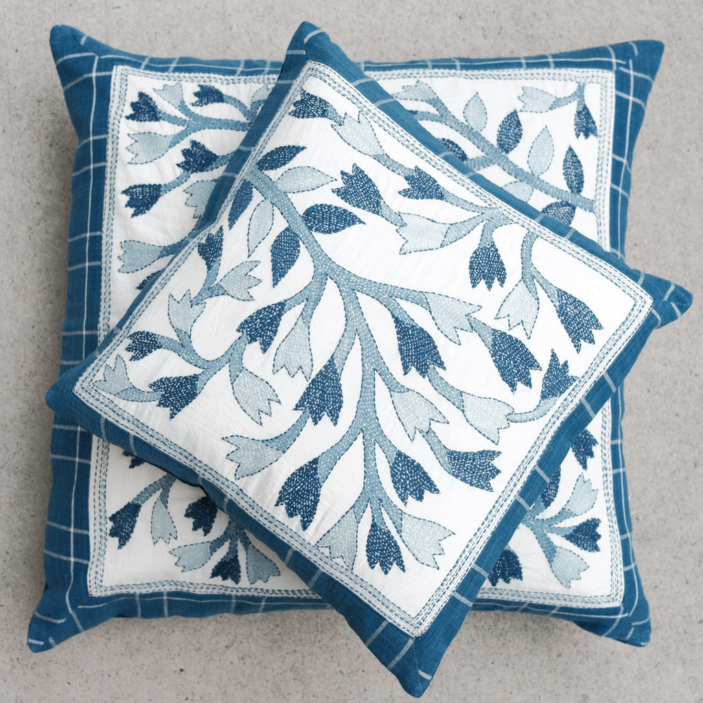 An exceptional handstitched cushion cover to adorn a special spot in your home. Made of artisan cloth - where threads were first dyed in natural fermentation indigo vats, then handwoven by skilled weavers. Finally, each piece has been adorned with handstitching in Sundarbans, India. Each piece is unique and has a story to tell.