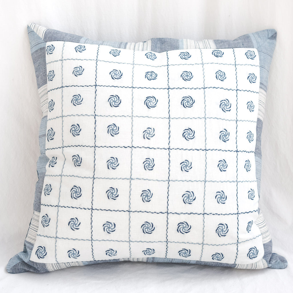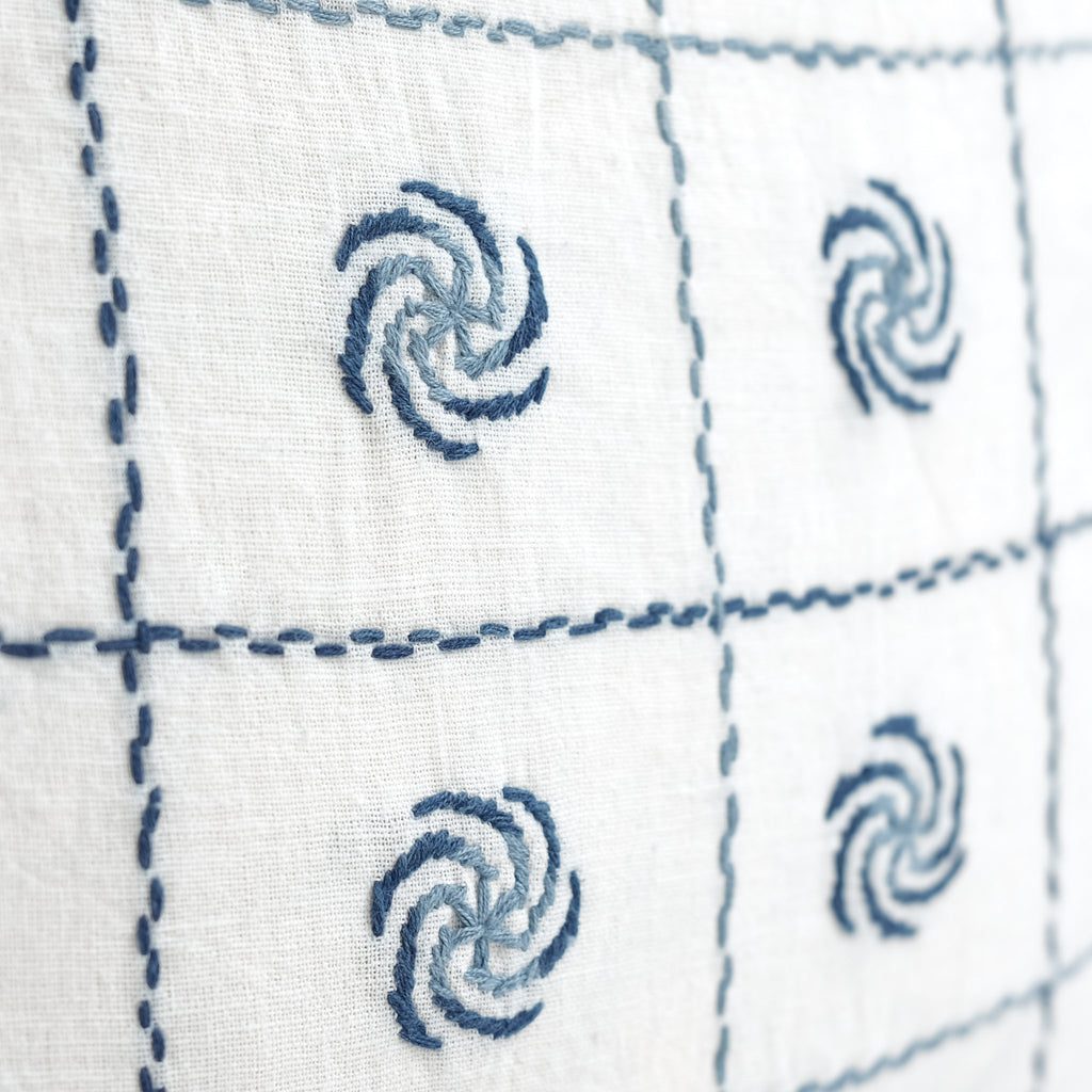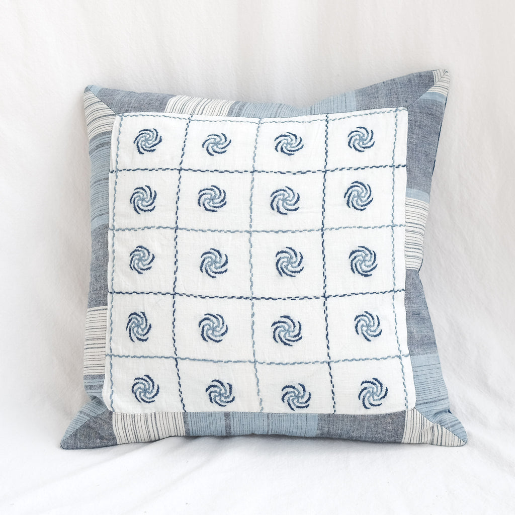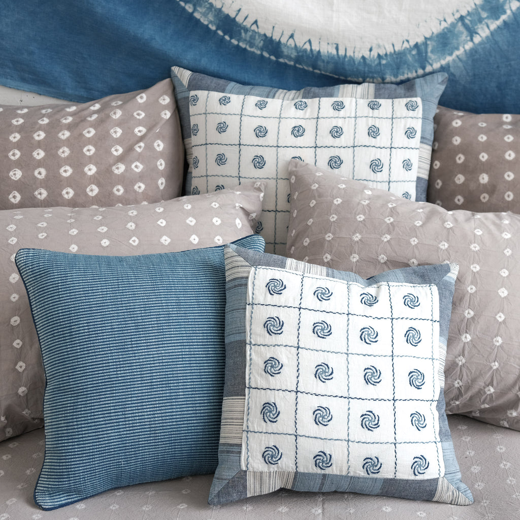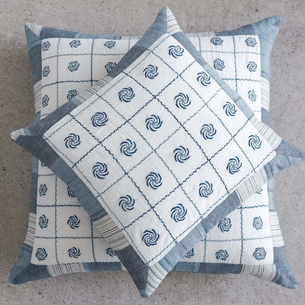 An exceptional handstitched cushion cover to adorn a special spot in your home. Made of artisan cloth - where threads were first dyed in natural fermentation indigo vats, then handwoven by skilled weavers. Finally, each piece has been adorned with handstitching in Sundarbans, India. Each piece is unique and has a story to tell.