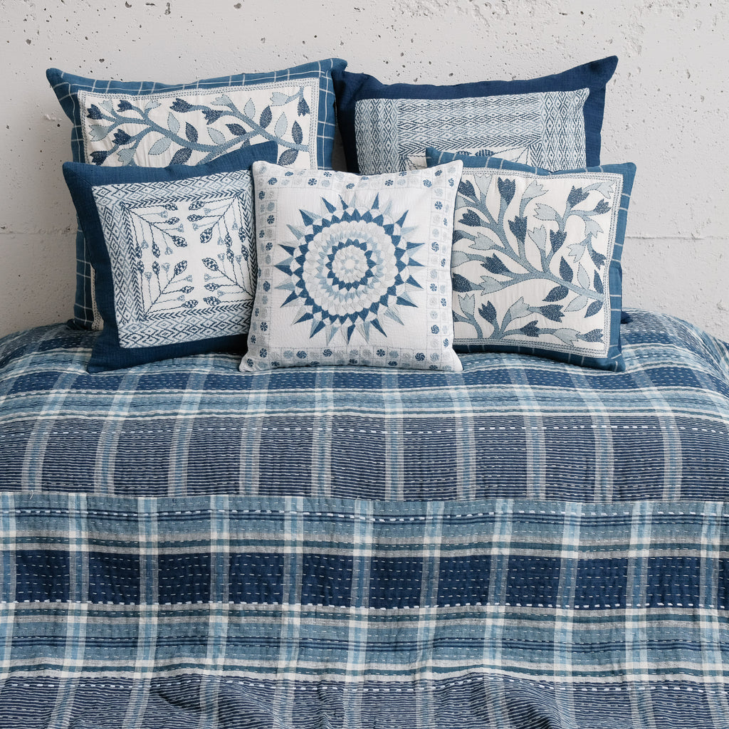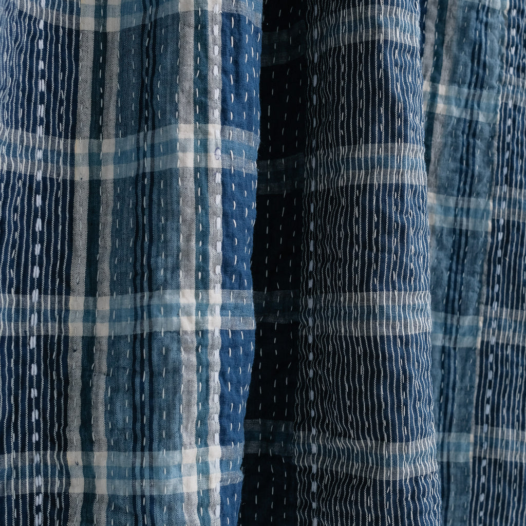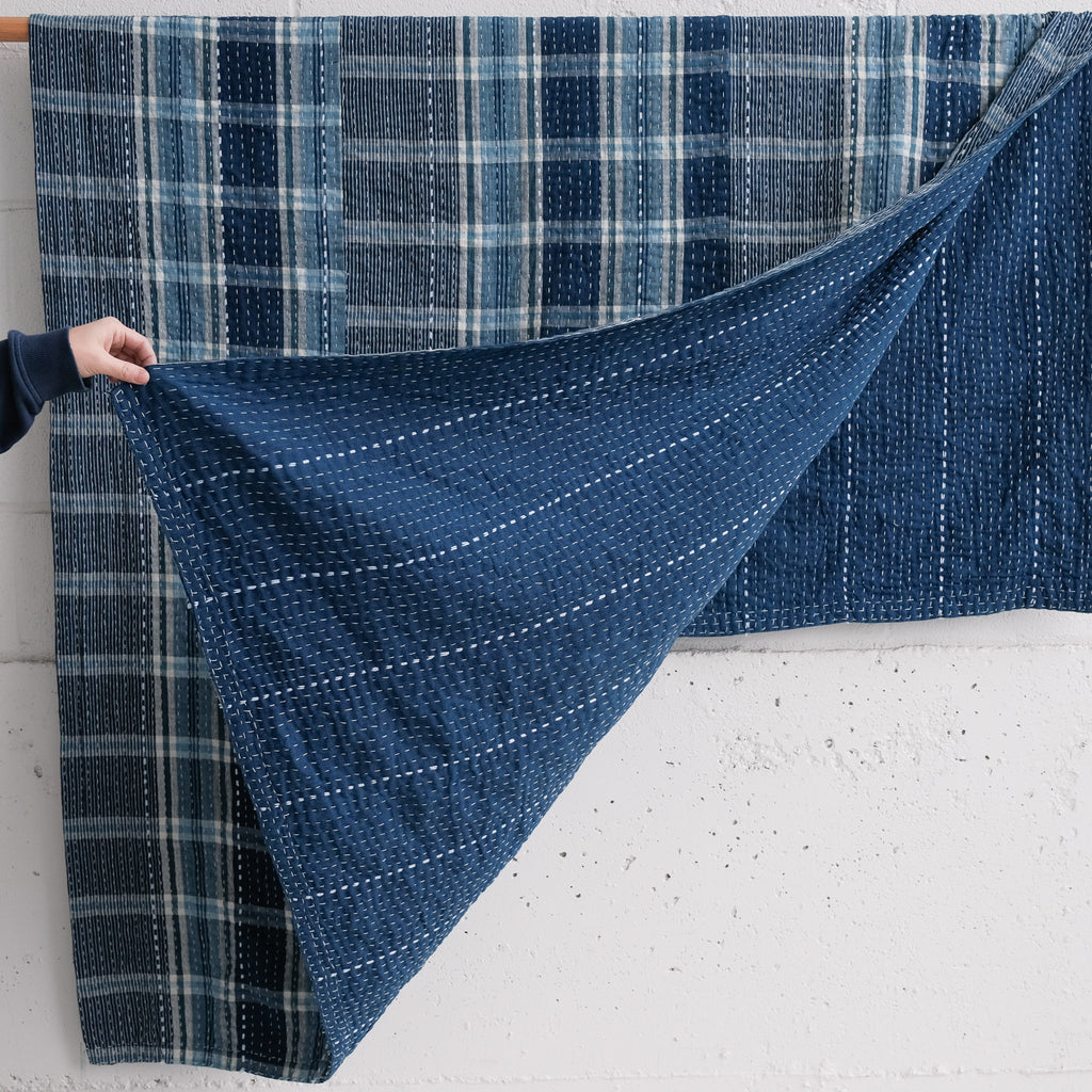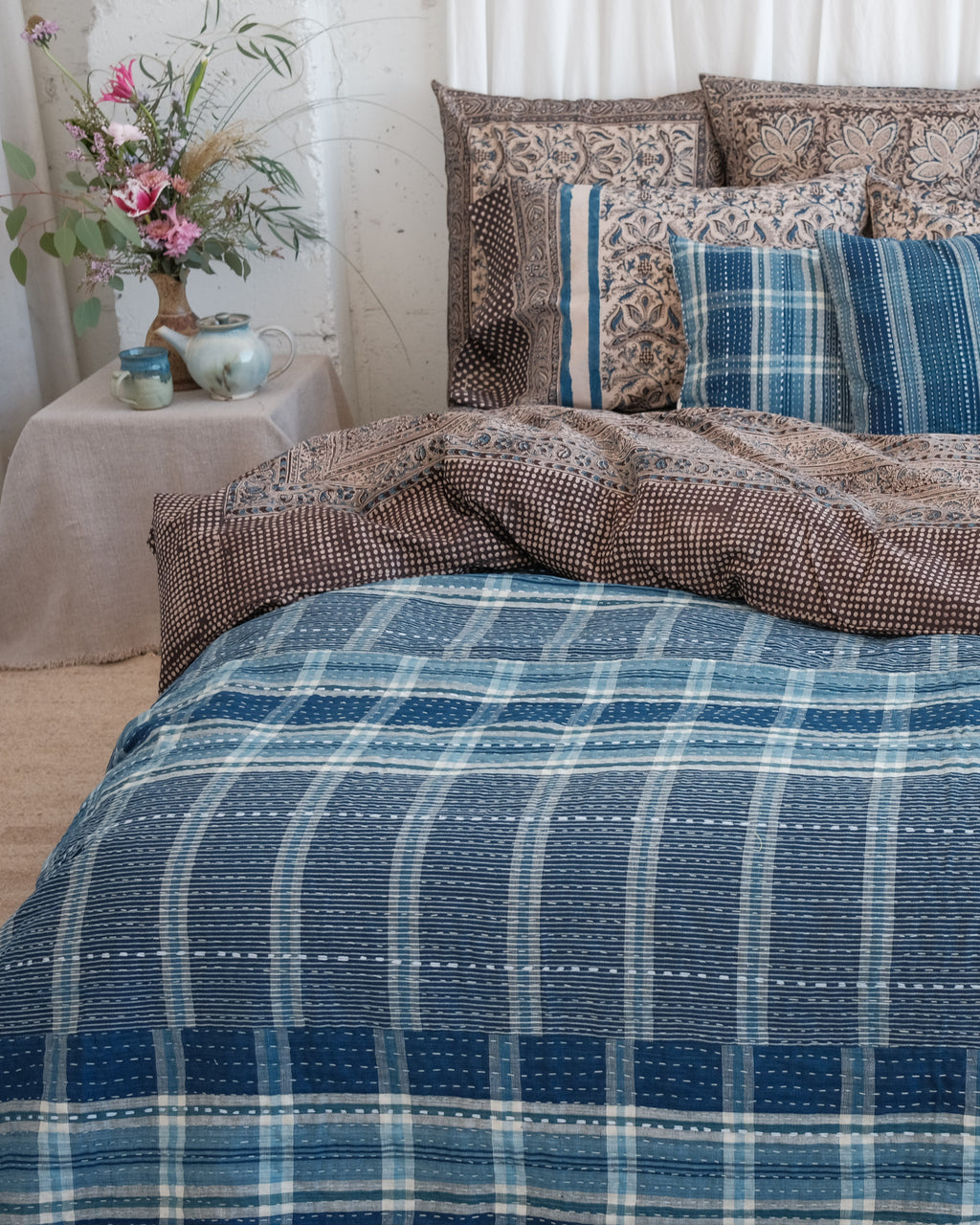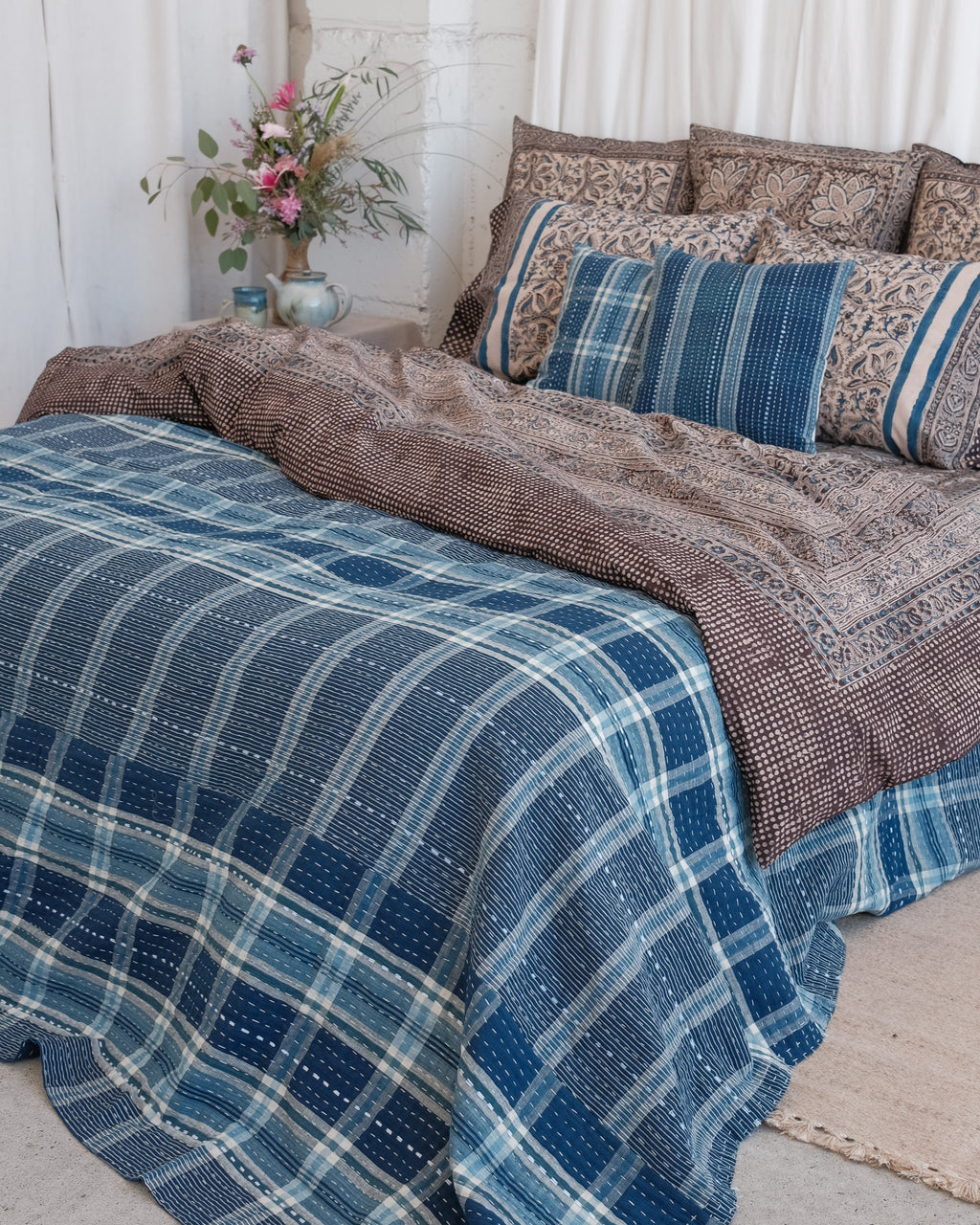 This exceptional handstitched quilt will bring warmth and wonder to your home. Made of artisan cloth - where threads first were dyed in natural fermentation indigo vats, then handwoven by skilled weavers, pieced together, and finally handstitched in Sundarbans, India. Each piece is unique and has a story to tell.