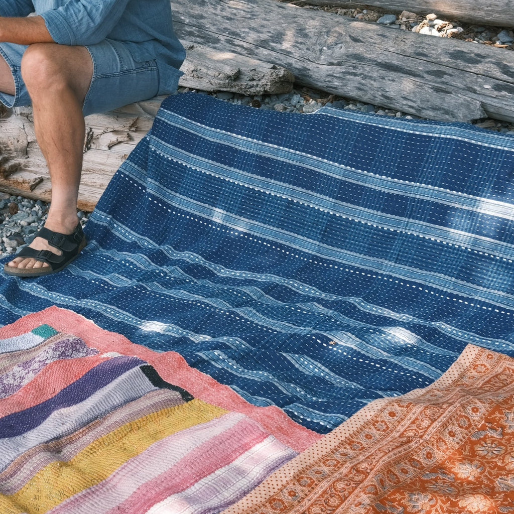 This exceptional handstitched quilt will bring warmth and wonder to your home. Made of artisan cloth - where threads first were dyed in natural fermentation indigo vats, then handwoven by skilled weavers, pieced together, and finally handstitched in Sundarbans, India. Each piece is unique and has a story to tell.
