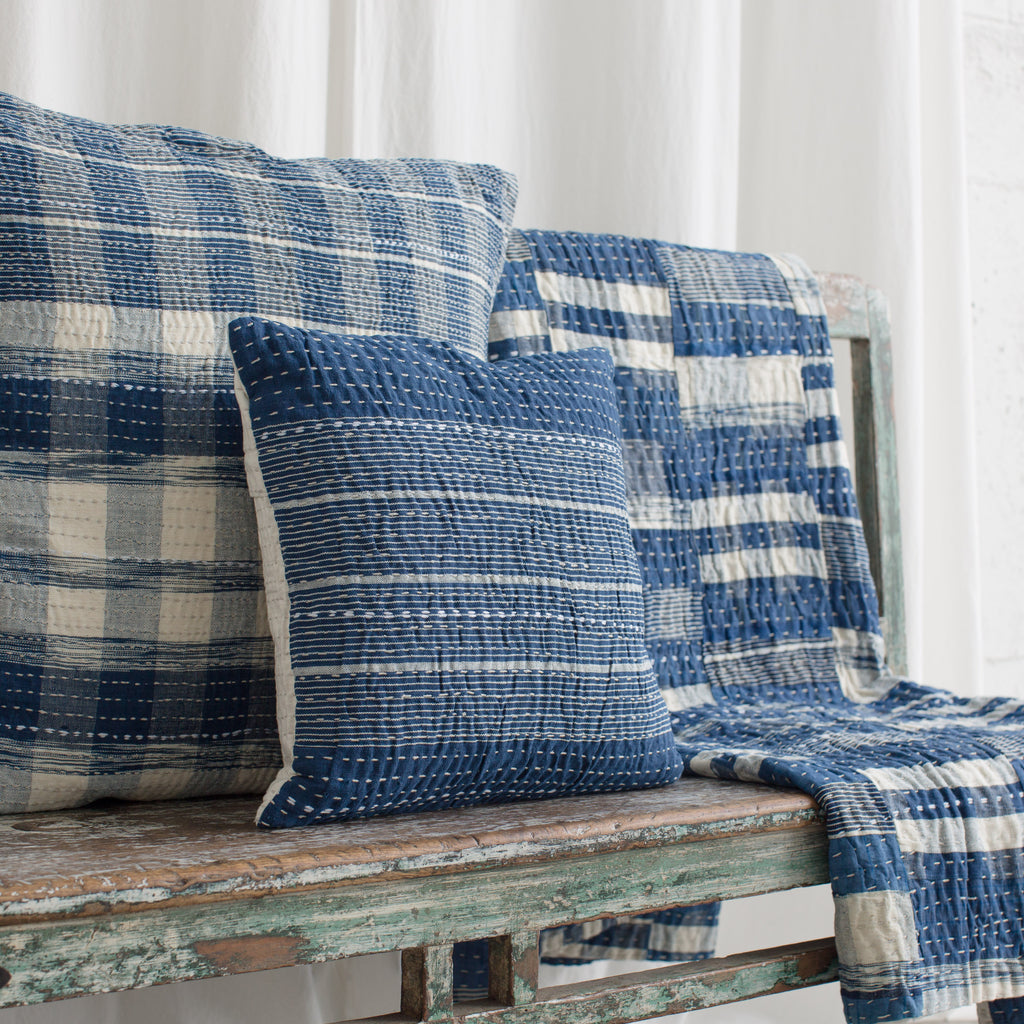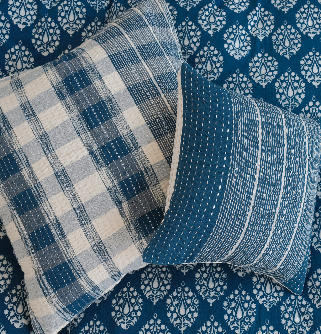 Hand stitched quilted cushion cover made with naturally dyed indigo cotton.