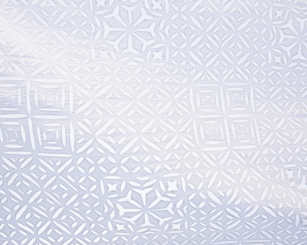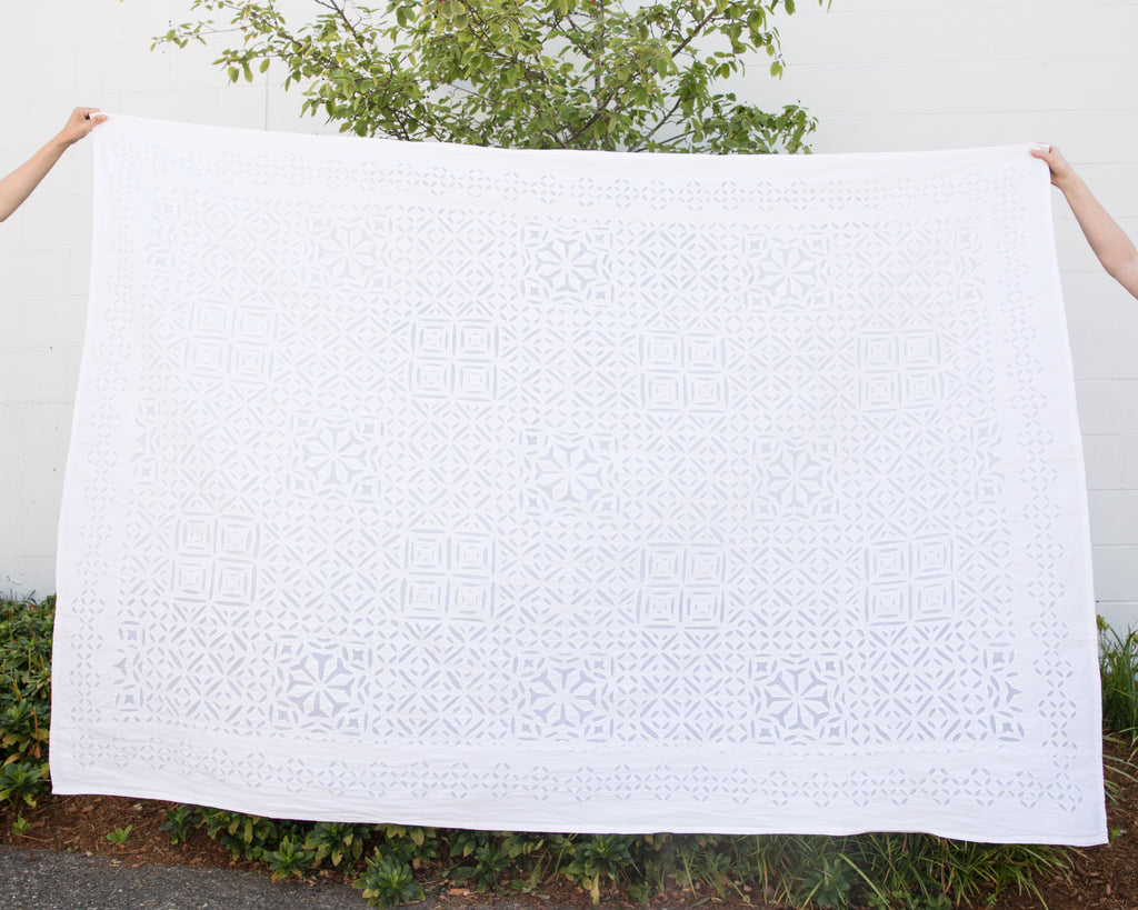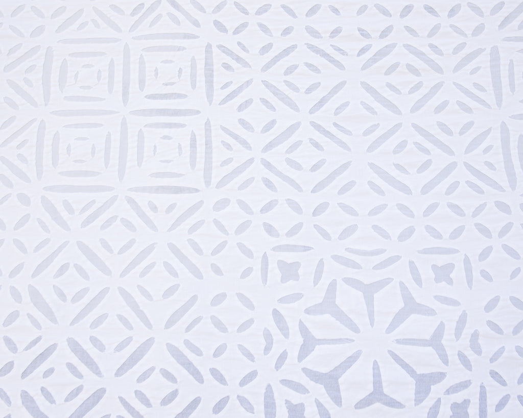 This intricate handstitched appliqué has a luminous quality when the light pours through it. It is made by using two layers of white cotton - a medium weight layer that the design is cut into and stitched on a fine lightweight layer, creating elegant translucent designsThis textile comes to life in a home when used as a wall hanging, window covering, bedspread, table cover, or whatever else you can imagine.
