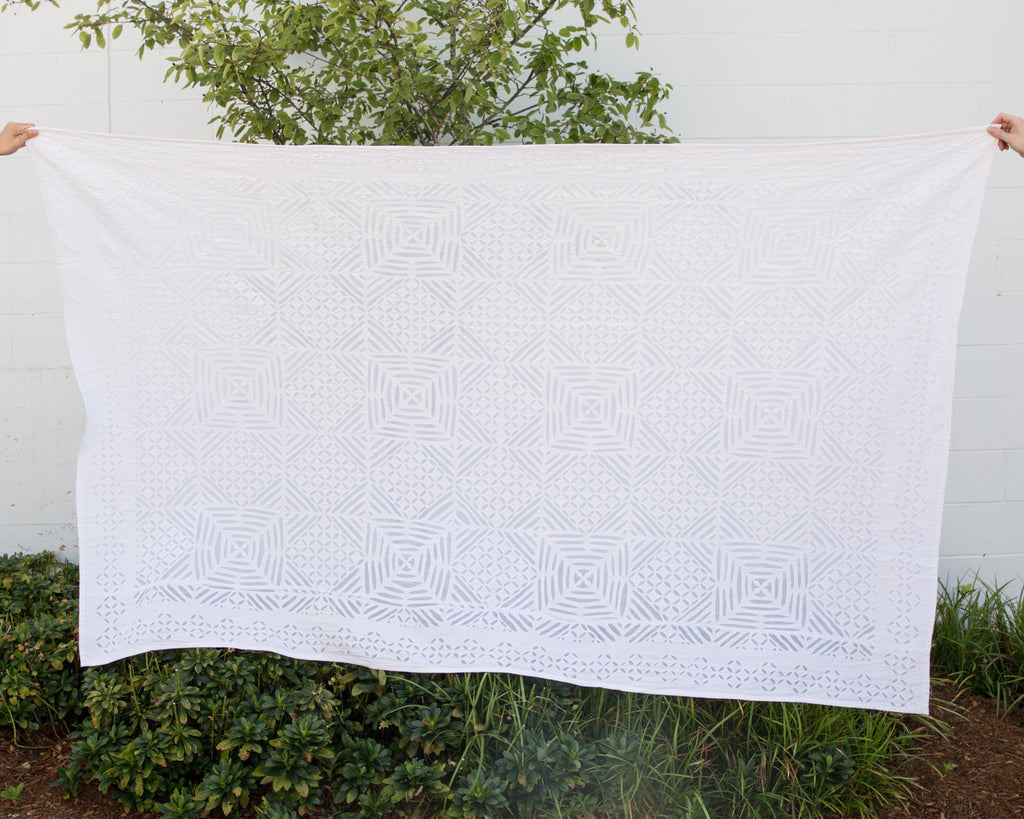 This intricate handstitched appliqué has a luminous quality when the light pours through it. It is made by using two layers of white cotton - a medium weight layer that the design is cut into and stitched on a fine lightweight layer, creating elegant translucent designsThis textile comes to life in a home when used as a wall hanging, window covering, bedspread, table cover, or whatever else you can imagine.