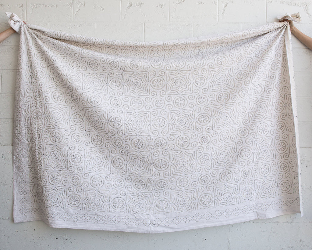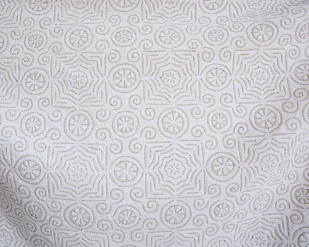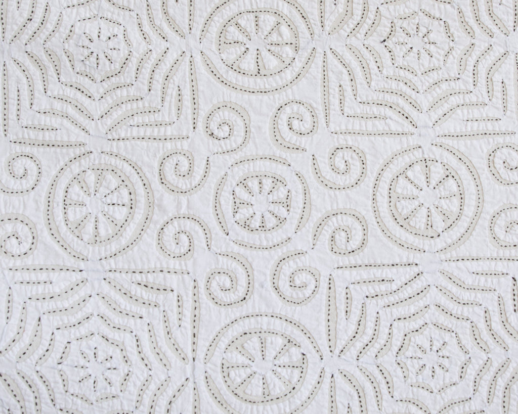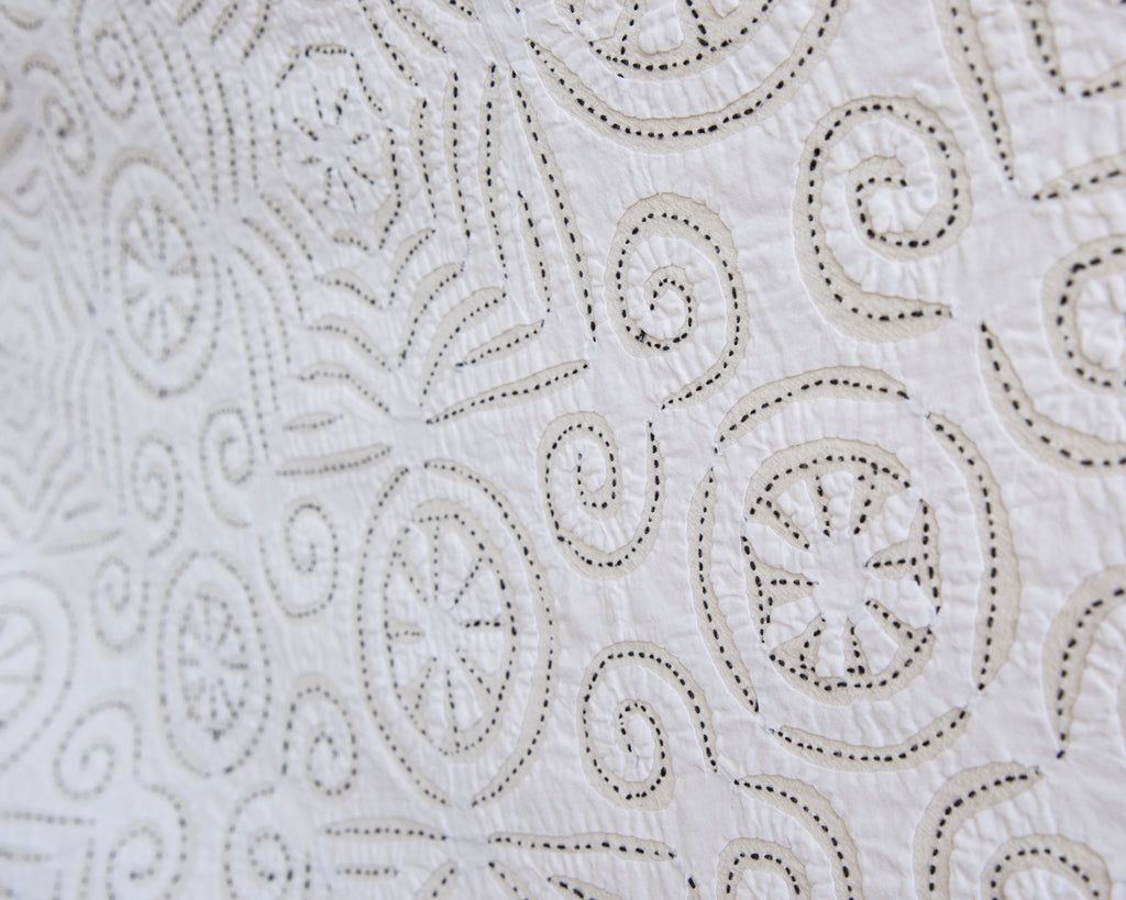 This intricate handstitched appliqué textile is created by using two layers of medium weight cotton. The design is cut on white fabric, appliquéd onto a natural base, and handstitched with black thread to amplify the design. This textile looks great as a bedspread, tablecloth, or wall hanging.