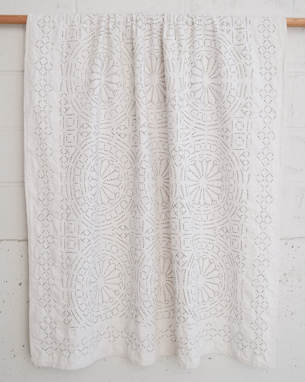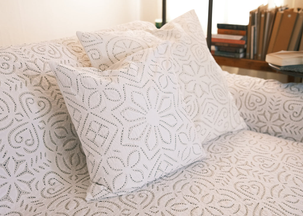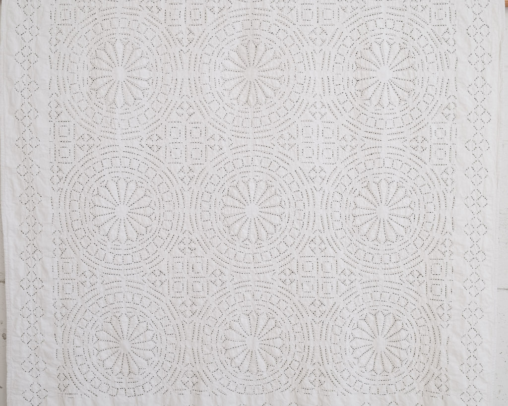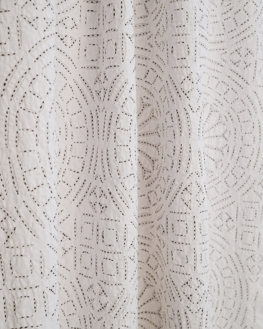 This intricate handstitched appliqué textile is created by using two layers of medium weight cotton. The design is cut on white fabric, appliquéd onto a natural base, and handstitched with black thread to amplify the design. This textile looks great as a bedspread, tablecloth, or wall hanging.
