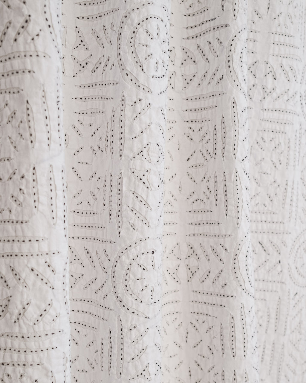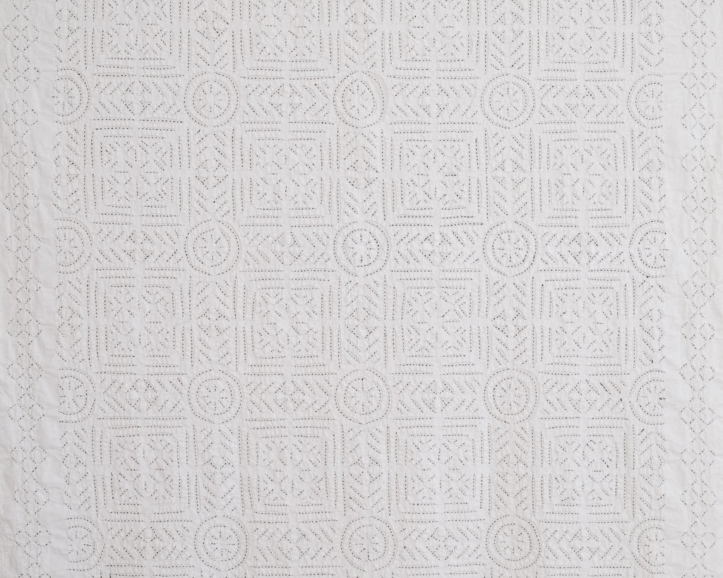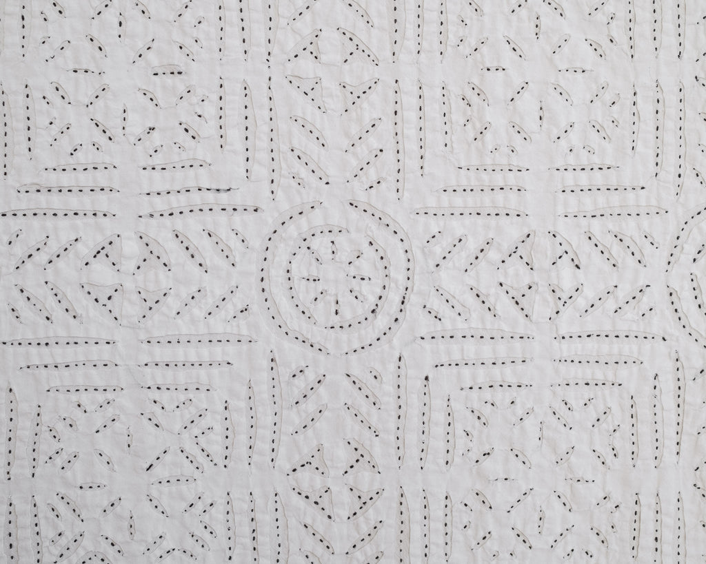 This intricate handstitched appliqué textile is created by using two layers of medium weight cotton. The design is cut on white fabric, appliquéd onto a natural base, and handstitched with black thread to amplify the design. This textile looks great as a bedspread, tablecloth, or wall hanging.