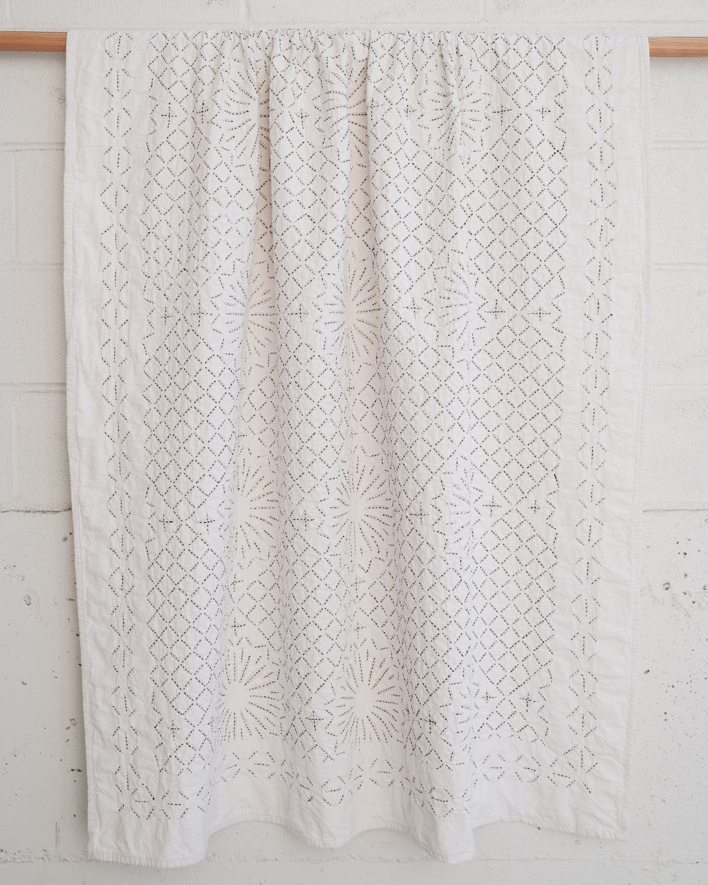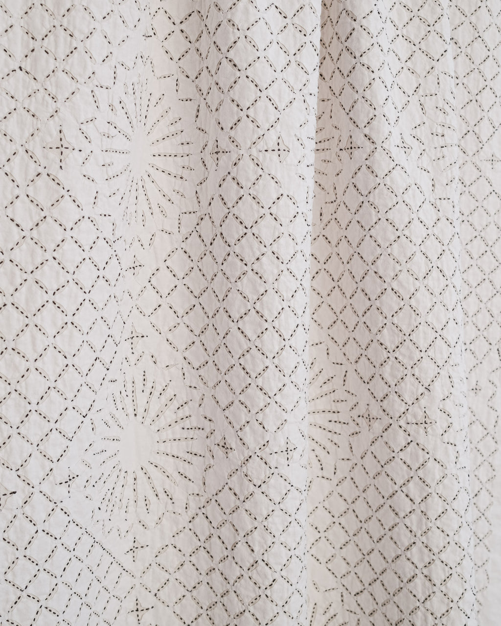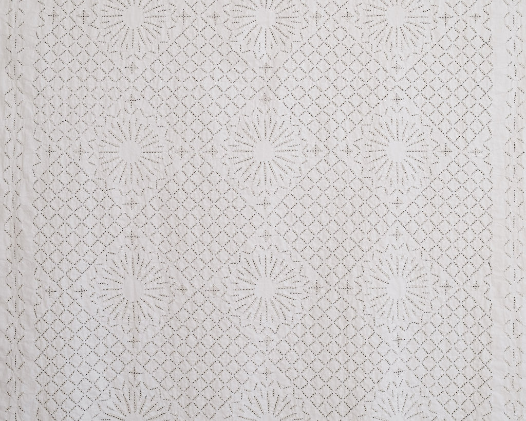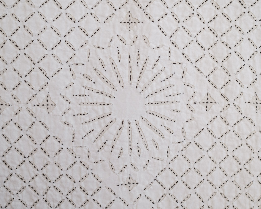 This intricate handstitched appliqué textile is created by using two layers of medium weight cotton. The design is cut on white fabric, appliquéd onto a natural base, and handstitched with black thread to amplify the design. This textile looks great as a bedspread, tablecloth, or wall hanging.