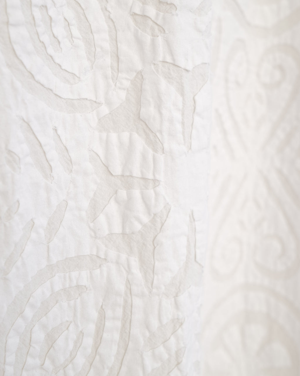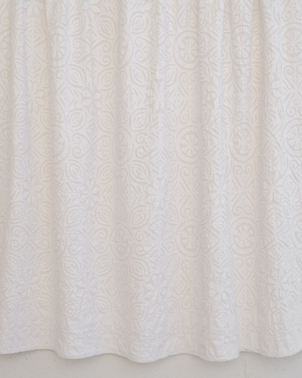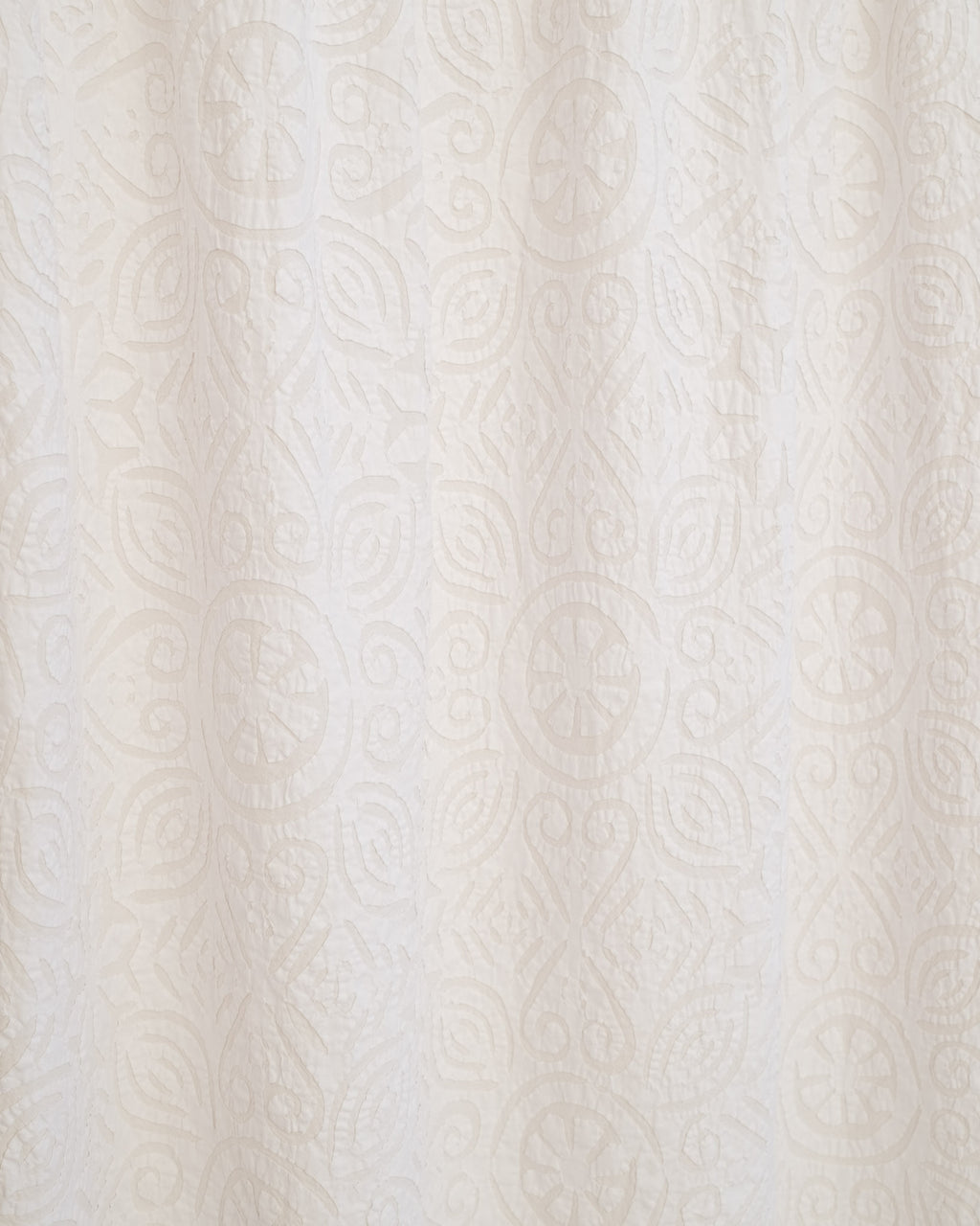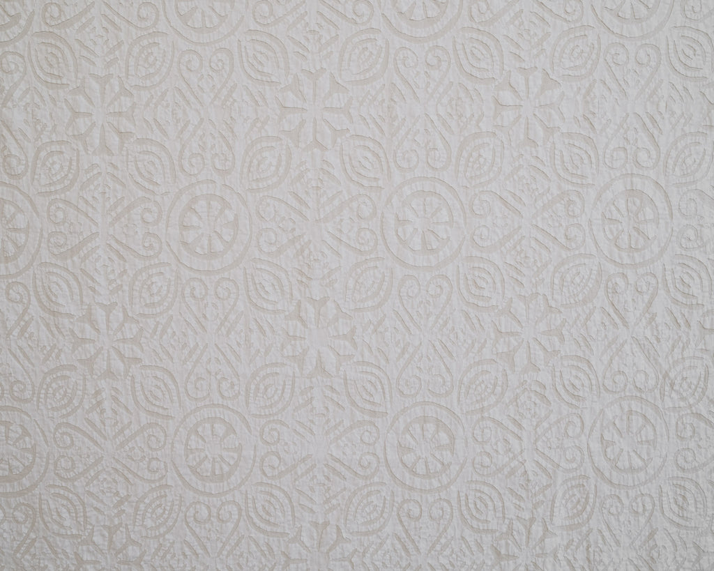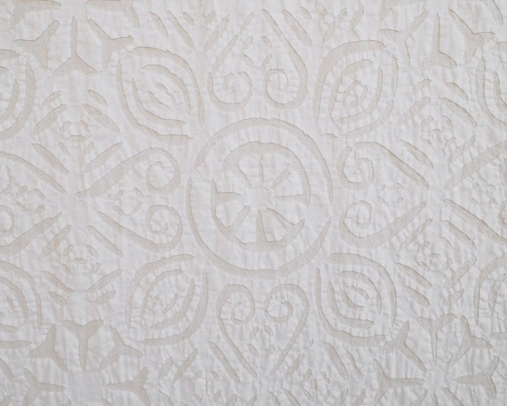 This intricate handstitched appliqué textile is created by using two layers of medium weight cotton. The design is cut into white fabric and appliquéd onto a natural base, creating a harmonious interplay of pattern and texture. This textile looks great as a bedspread, tablecloth, or wall hanging.