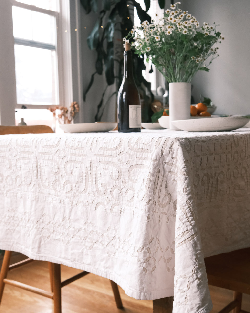 This intricate handstitched appliqué textile is created by using two layers of medium weight cotton. The design is cut into white fabric and appliquéd onto a natural base, creating a harmonious interplay of pattern and texture. This textile looks great as a bedspread, tablecloth, or wall hanging.