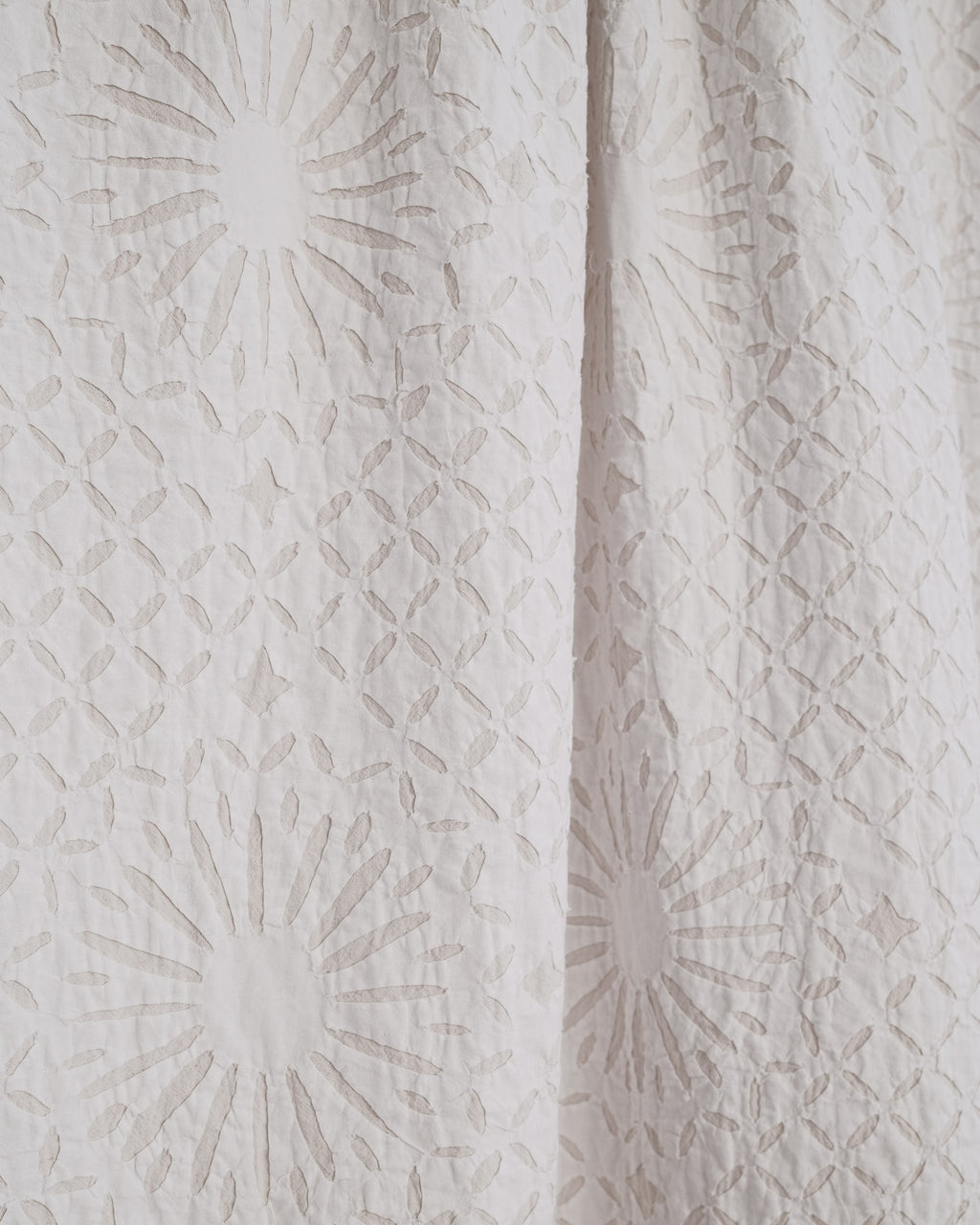 This intricate handstitched appliqué textile is created by using two layers of medium weight cotton. The design is cut into white fabric and appliquéd onto a natural base, creating a harmonious interplay of pattern and texture. This textile looks great as a bedspread, tablecloth, or wall hanging.
