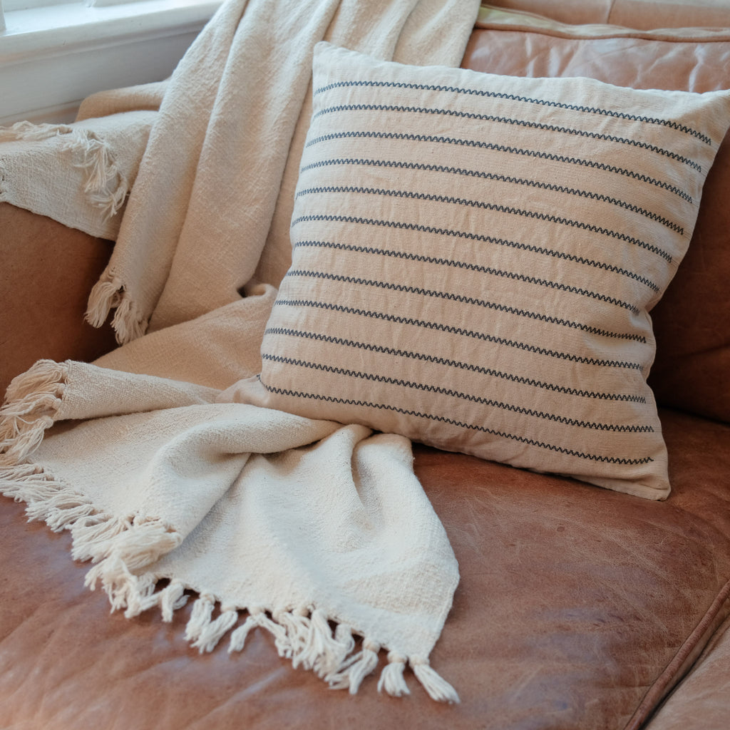 This 100% cotton cushion cover is handwoven on a back-strap loom by master weavers in Nagaland. These are contemporary yet distinctive tribal designs using a warp faced weaving technique and supplemental weft work.