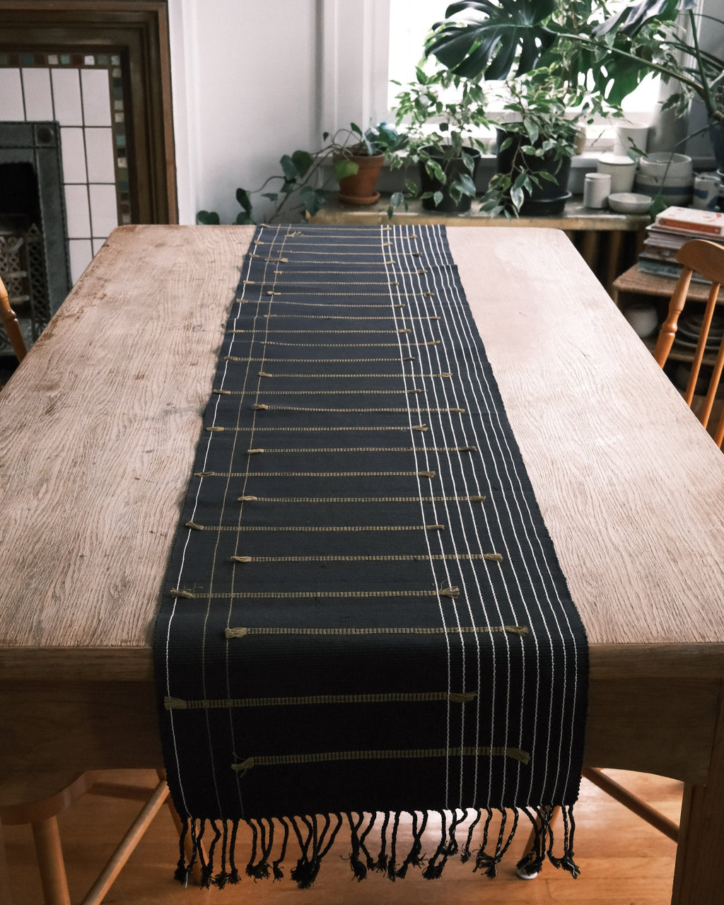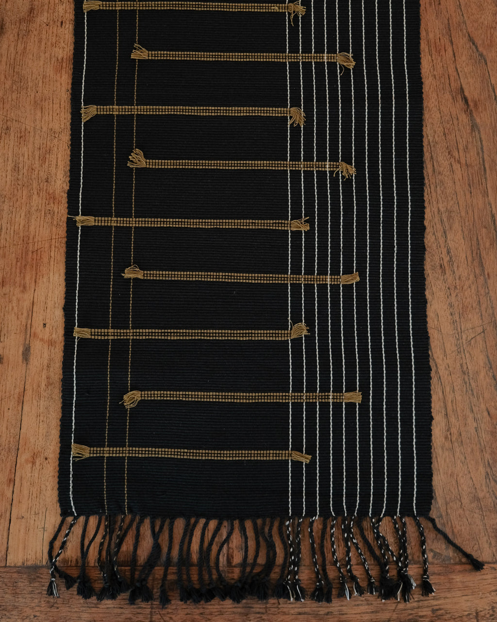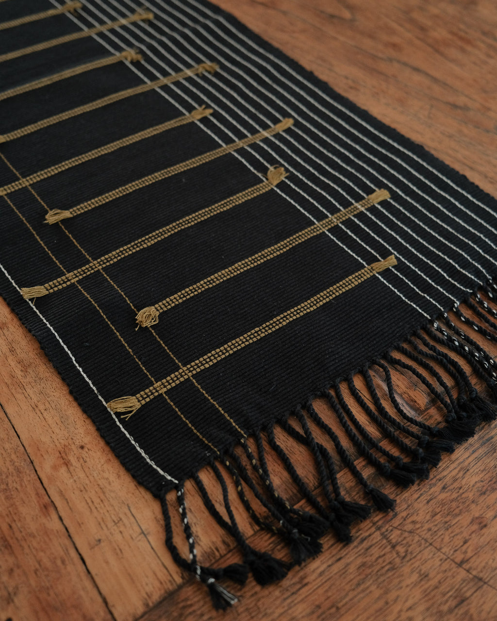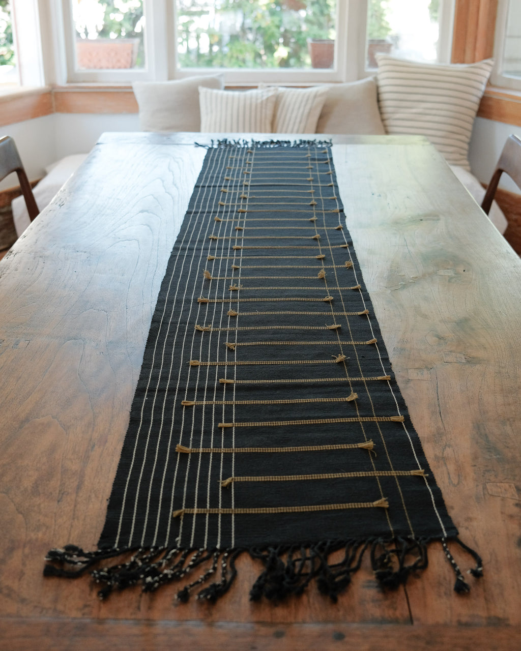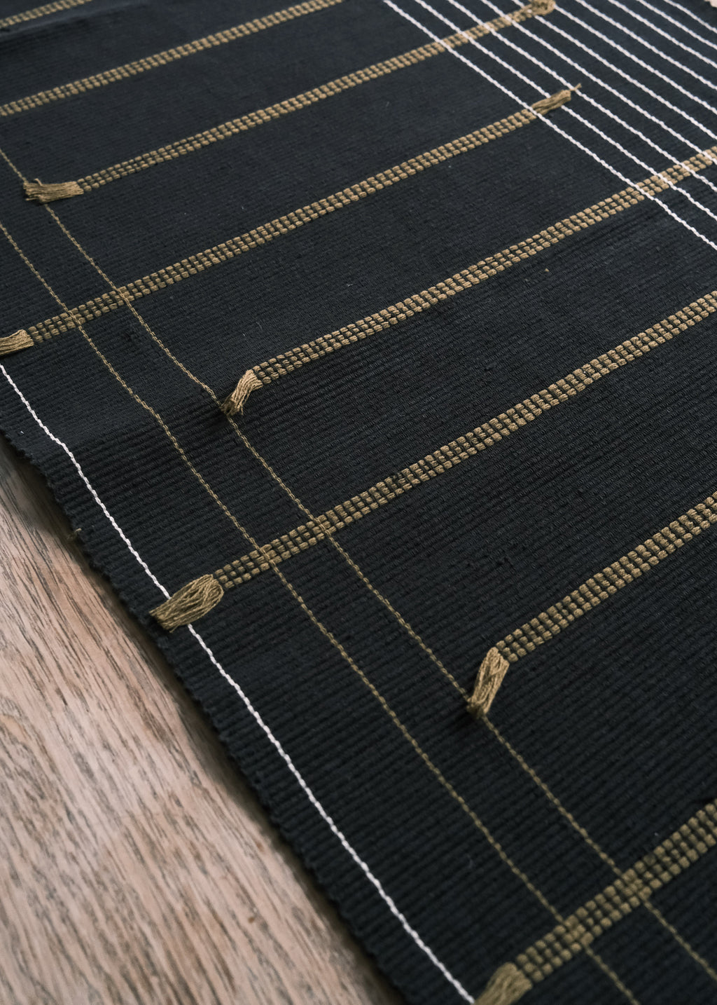 This 100% cotton placemat is handwoven on a back-strap loom by master weavers in Nagaland. These are contemporary yet distinctive tribal designs using a warp faced weaving technique and supplemental weft work. These pieces work beautifully as a table runner, a feature at the end of a bed, or displayed as a wall hanging.