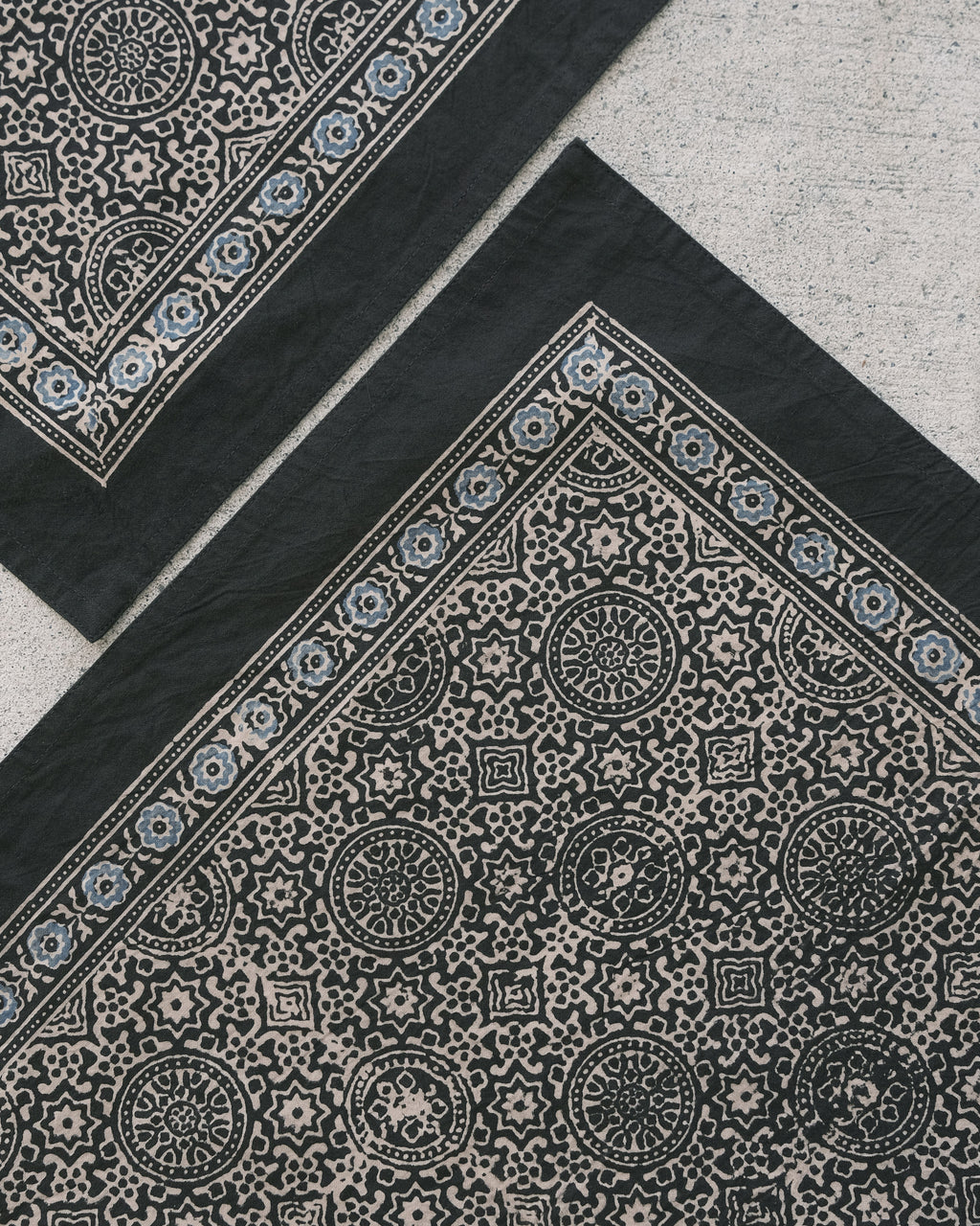 Ajrakh is a traditional style of block printing which uses hand-carved wooden blocks to print natural dyes on organic cotton. These Ajrakhs are made by a family that has been block printing for over nine generations - the Khatri family residing in the Kachchh desert of Gujarat, India.