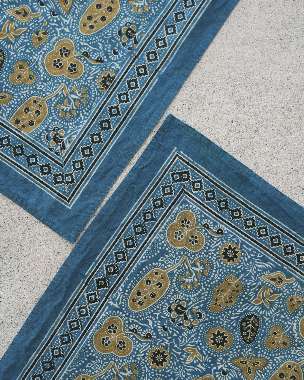 The process of making an Ajrakh is a long one, involving between thirteen and twenty distinct steps. The many processes of scouring, washing, printing, dyeing, and final washing can take up to three weeks to complete. Much of the beauty and depth of Ajrakh cloth comes from the intricacy of the imprint that is left by the artisan’s hand. Slight variations are to be celebrated.