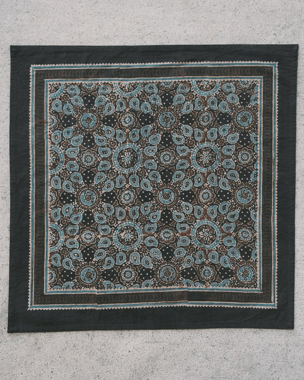 The process of making an Ajrakh is a long one, involving between thirteen and twenty distinct steps. The many processes of scouring, washing, printing, dyeing, and final washing can take up to three weeks to complete. Much of the beauty and depth of Ajrakh cloth comes from the intricacy of the imprint that is left by the artisan’s hand. Slight variations are to be celebrated.