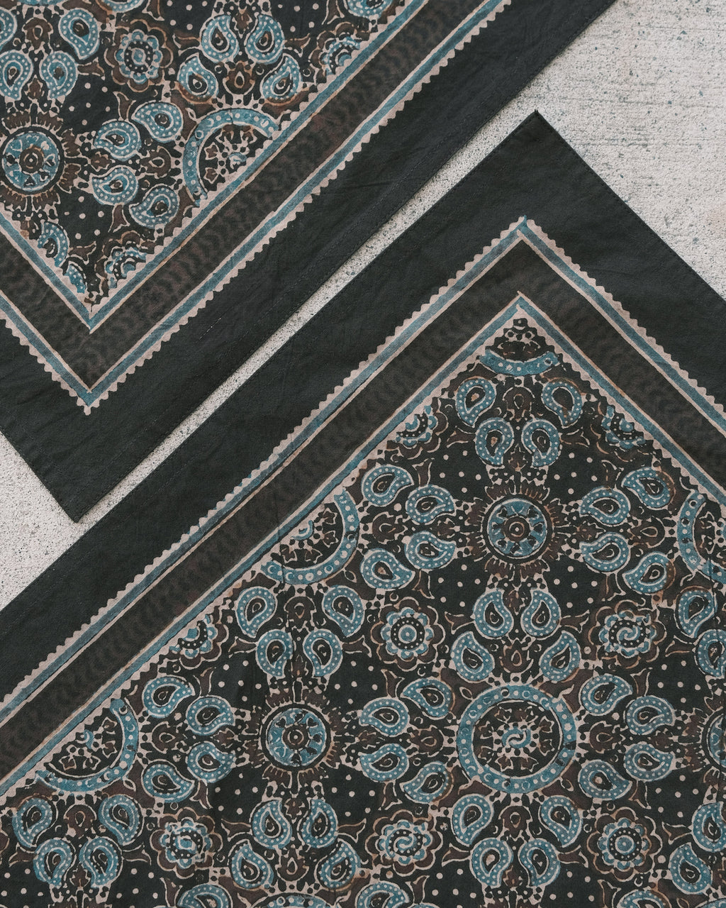Ajrakh is a traditional style of block printing which uses hand-carved wooden blocks to print natural dyes on organic cotton. These Ajrakhs are made by a family that has been block printing for over nine generations - the Khatri family residing in the Kachchh desert of Gujarat, India.