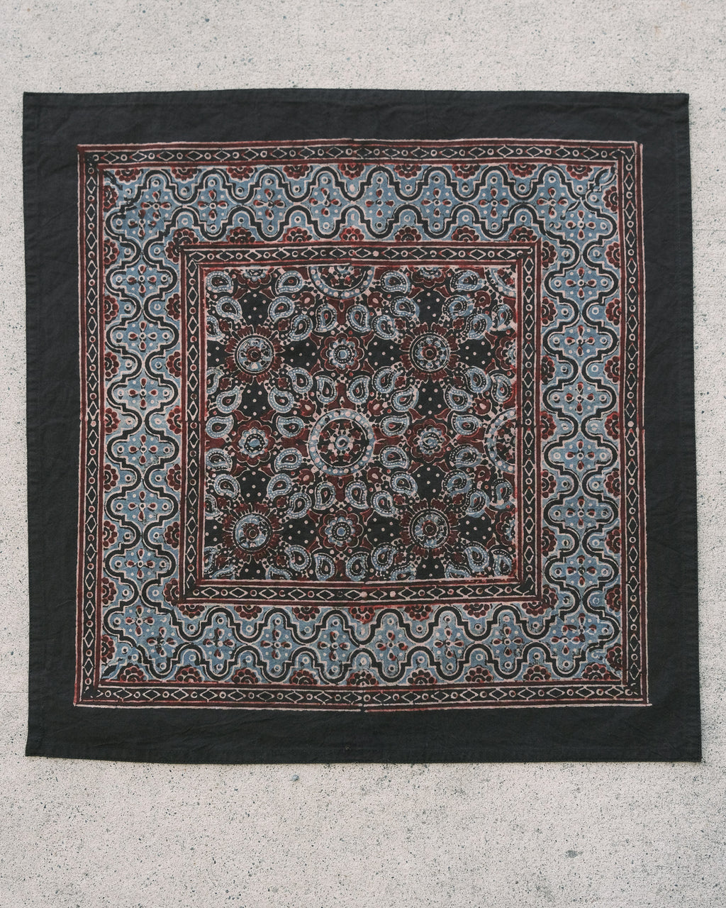 Ajrakh is a traditional style of block printing which uses hand-carved wooden blocks to print natural dyes on organic cotton. These Ajrakhs are made by a family that has been block printing for over nine generations - the Khatri family residing in the Kachchh desert of Gujarat, India.