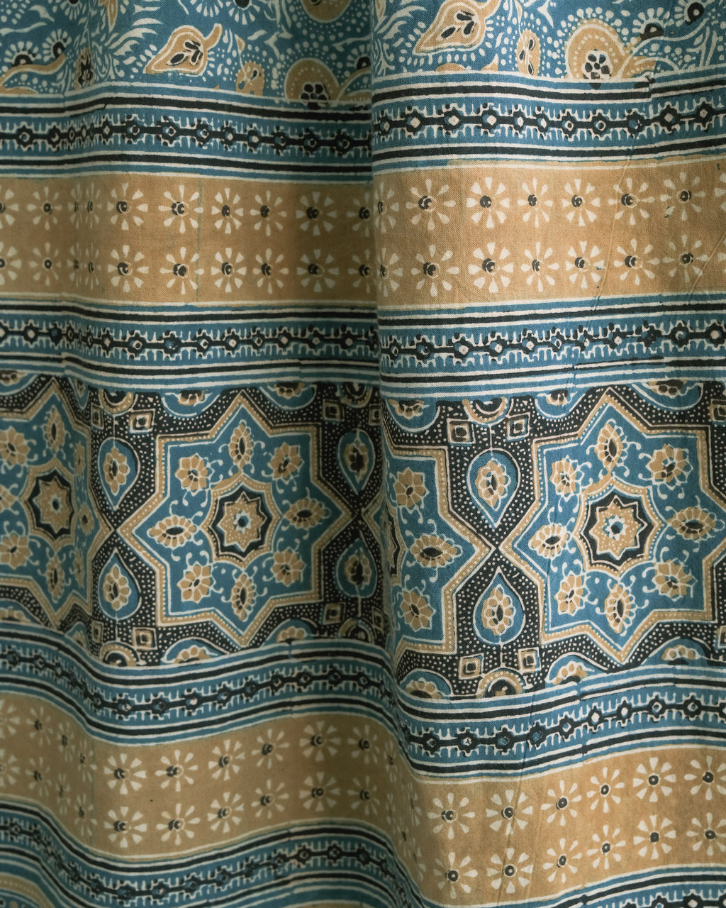 Ajrakh is a traditional style of block printing which uses hand-carved wooden blocks to print natural dyes on organic cotton. These Ajrakhs are made by a family that has been block printing for over nine generations - the Khatri family residing in the Kachchh desert of Gujarat, India.