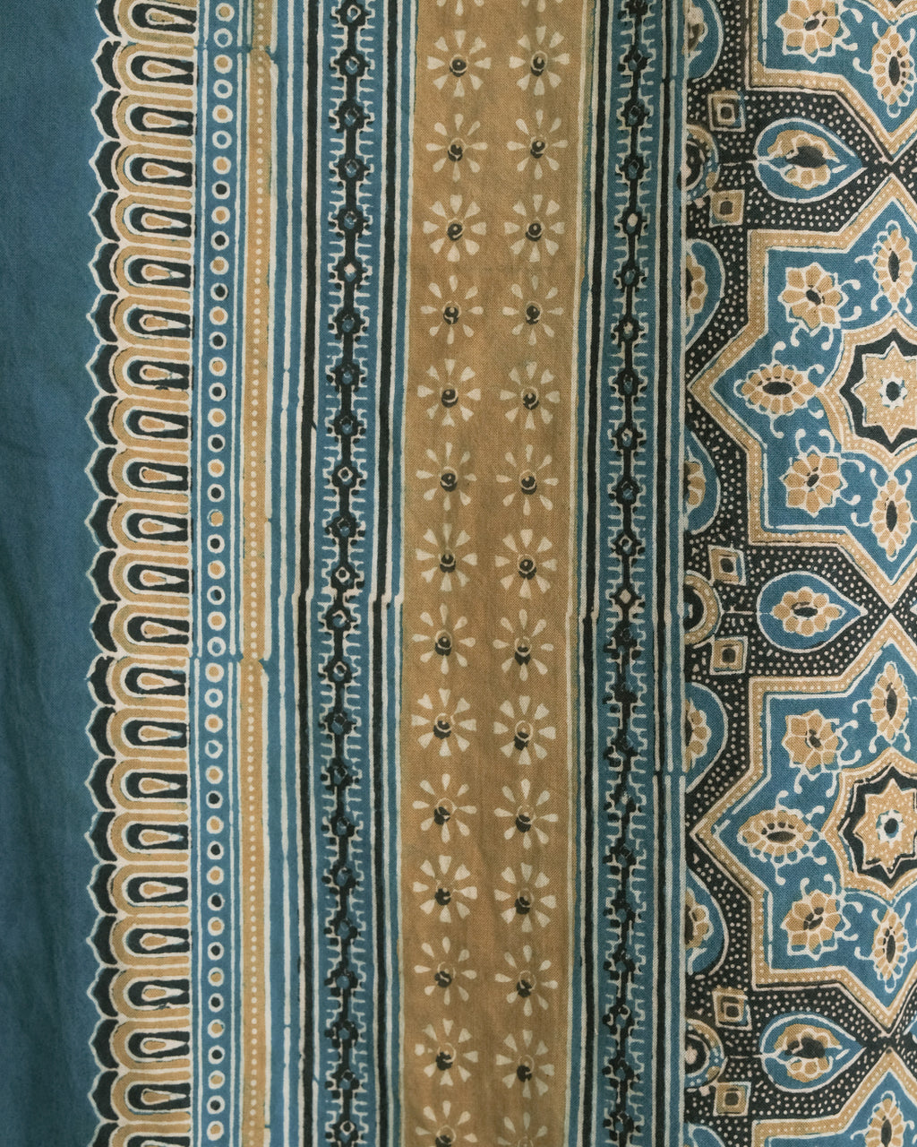 The process of making an Ajrakh is a long one, involving between thirteen and twenty distinct steps. The many processes of scouring, washing, printing, dyeing, and final washing can take up to three weeks to complete. Much of the beauty and depth of Ajrakh cloth comes from the intricacy of the imprint that is left by the artisan’s hand. Slight variations are to be celebrated.