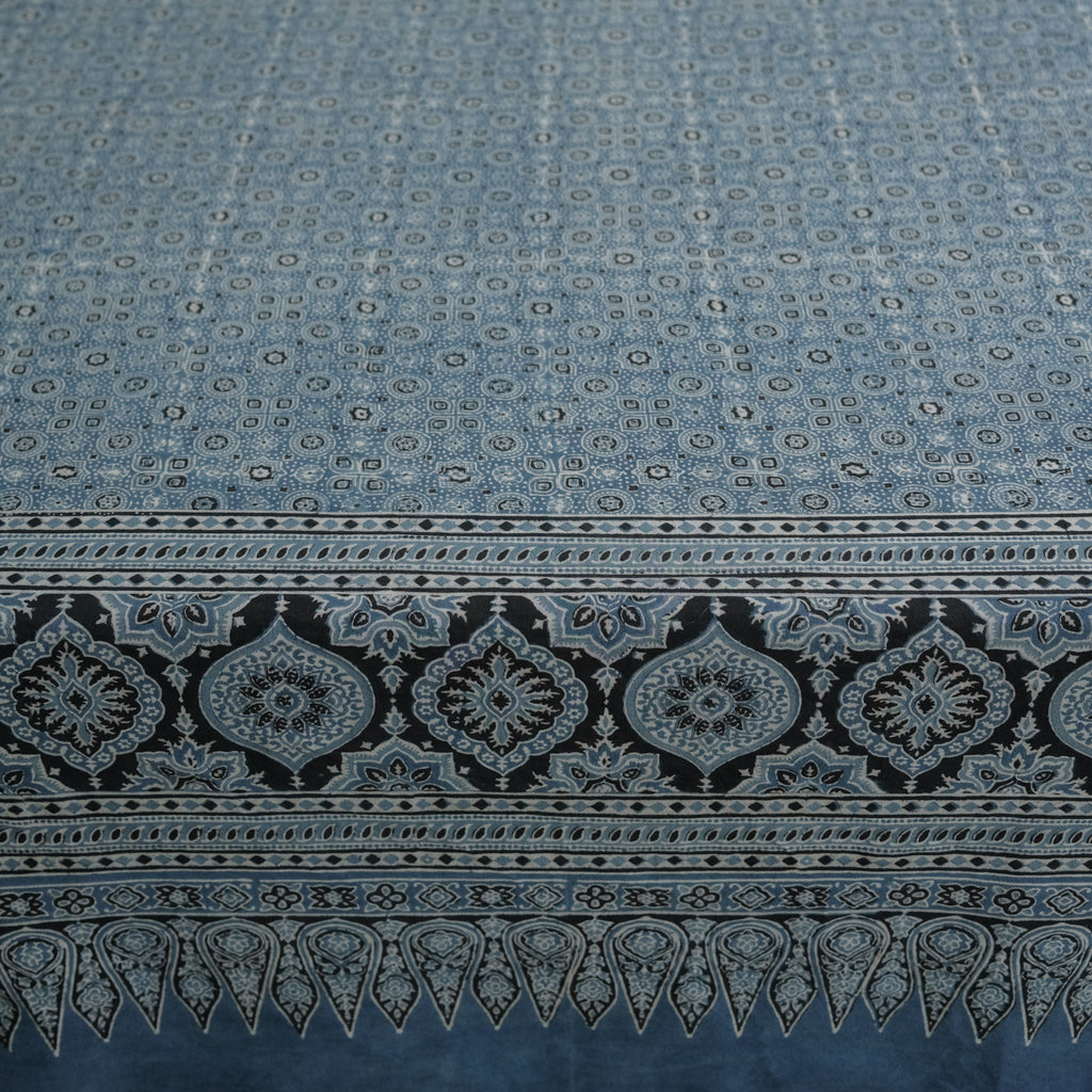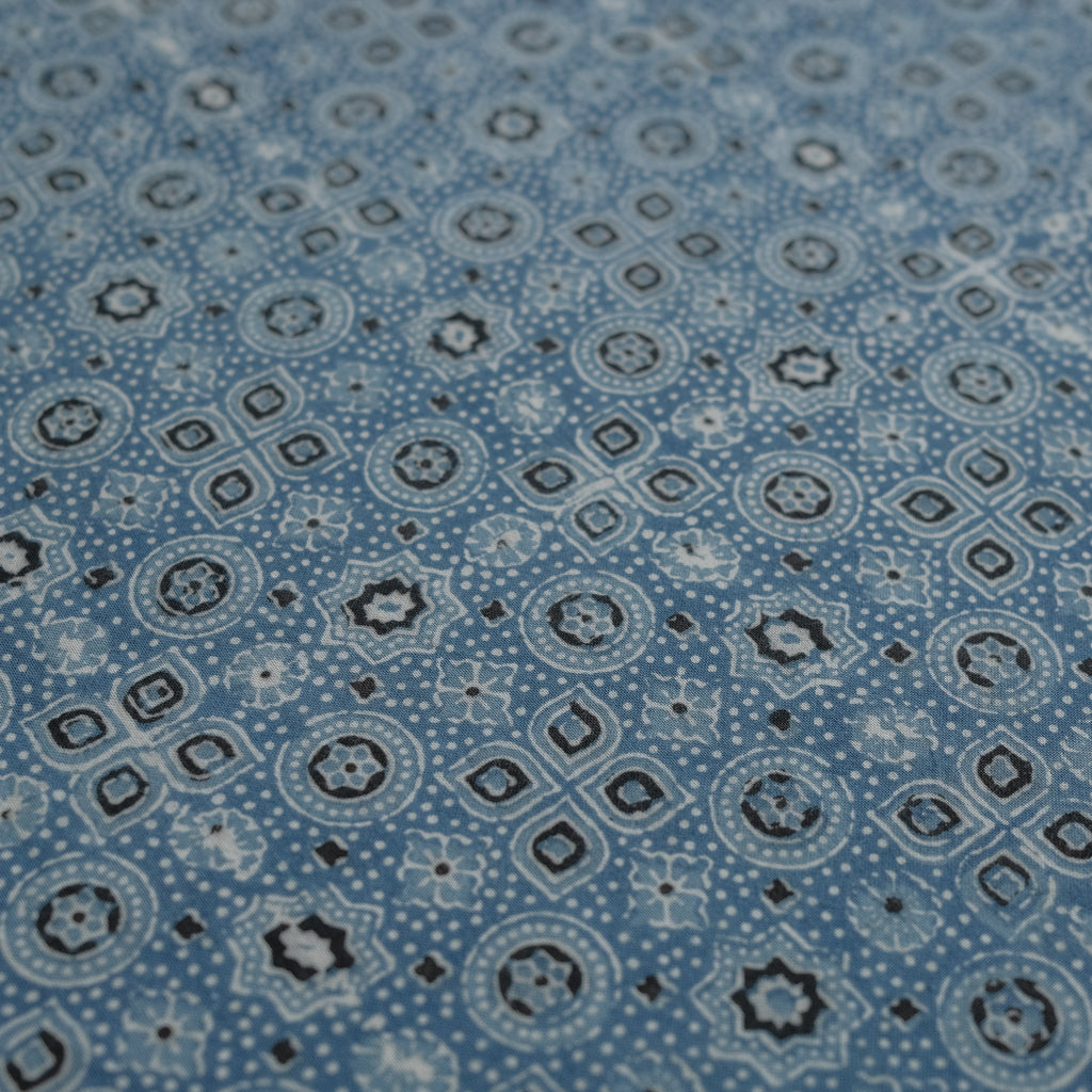 Ajrakh is a traditional style of block printing which uses hand-carved wooden blocks to print natural dyes on organic cotton. These Ajrakhs are made by a family that has been block printing for over nine generations - the Khatri family residing in the Kachchh desert of Gujarat, India.