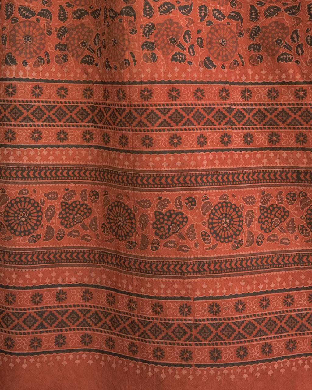 The process of making an Ajrakh is a long one, involving between thirteen and twenty distinct steps. The many processes of scouring, washing, printing, dyeing, and final washing can take up to three weeks to complete. Much of the beauty and depth of Ajrakh cloth comes from the intricacy of the imprint that is left by the artisan’s hand. Slight variations are to be celebrated.