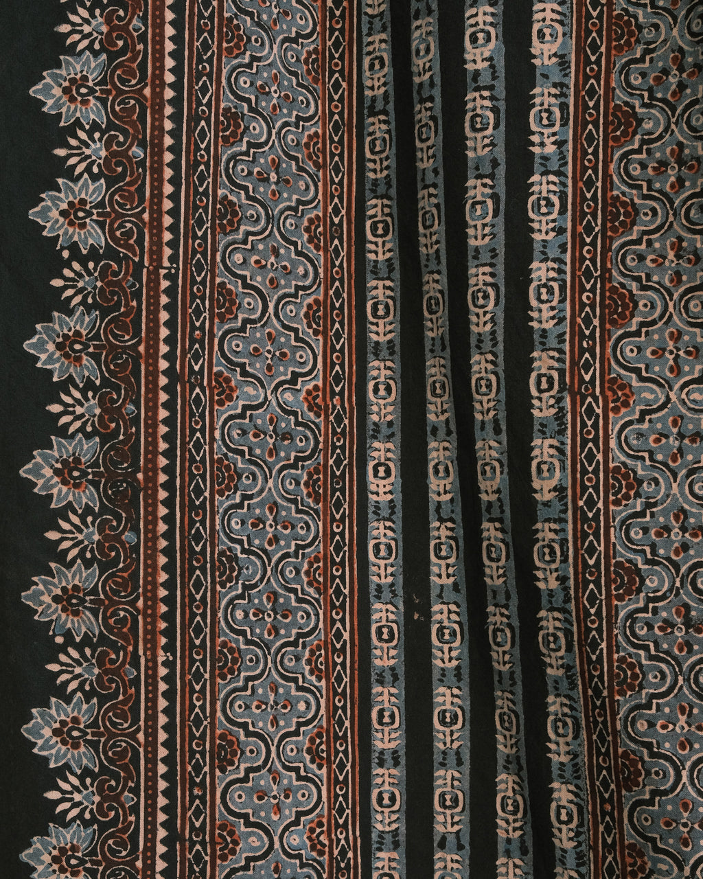 The process of making an Ajrakh is a long one, involving between thirteen and twenty distinct steps. The many processes of scouring, washing, printing, dyeing, and final washing can take up to three weeks to complete. Much of the beauty and depth of Ajrakh cloth comes from the intricacy of the imprint that is left by the artisan’s hand. Slight variations are to be celebrated.