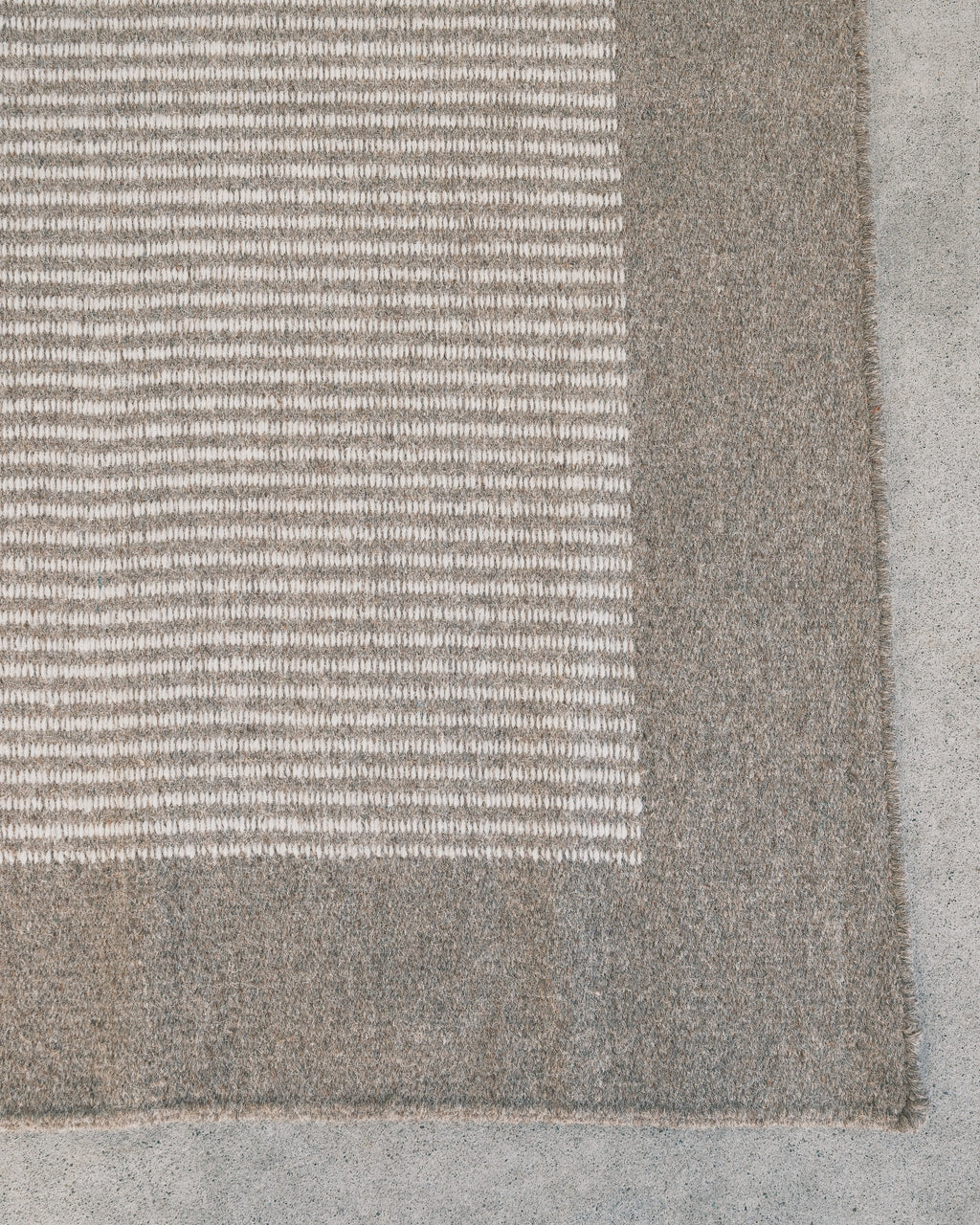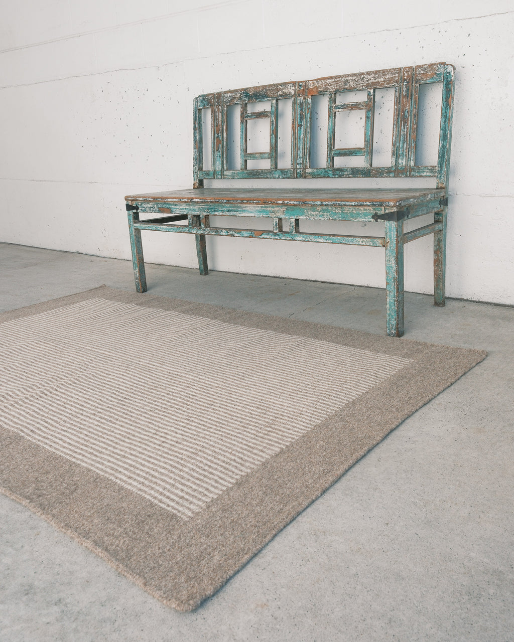 A handwoven wool carpet with a sturdy cotton warp made by village artisans in Rajasthan, India. The natural fibres of the local desert sheep make these flat-weave rugs long lasting and durable.