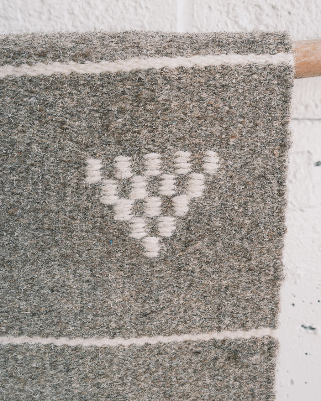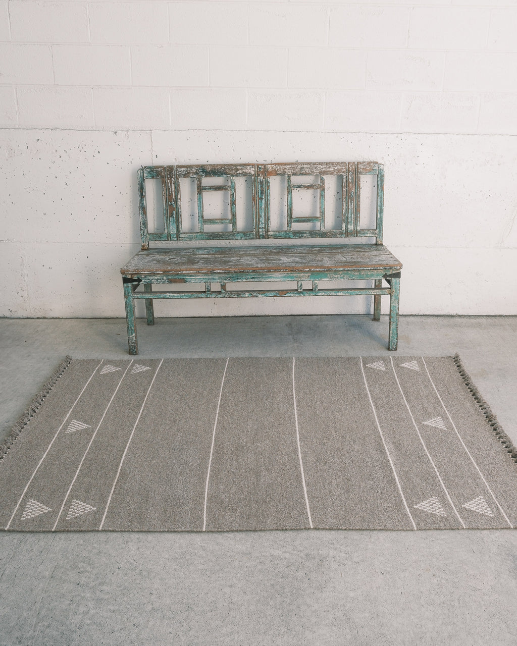 A handwoven wool carpet with a sturdy cotton warp made by village artisans in Rajasthan, India. The natural fibres of the local desert sheep make these flat-weave rugs long lasting and durable.