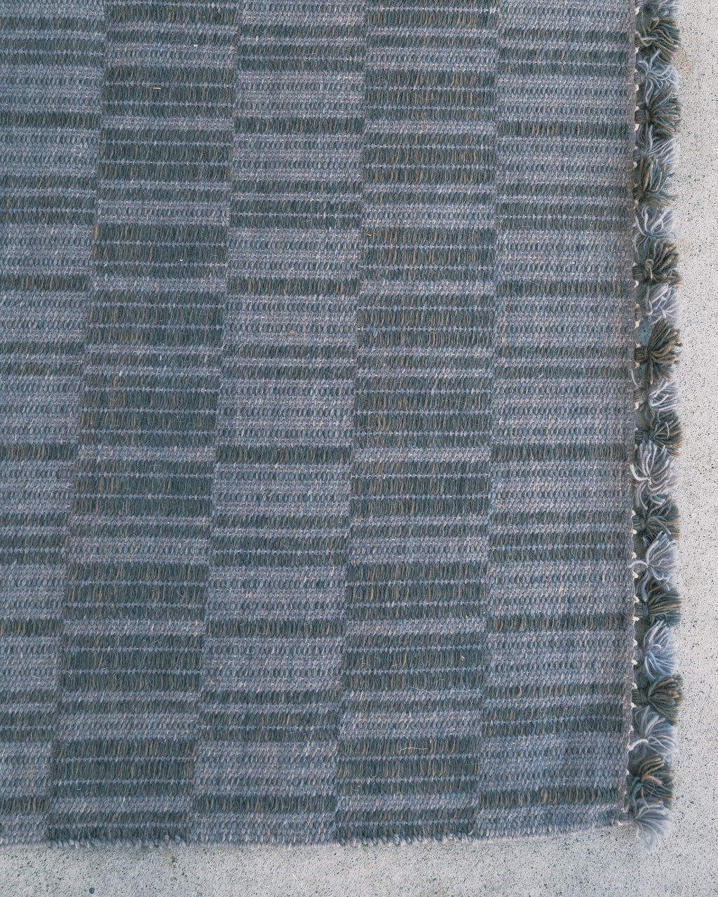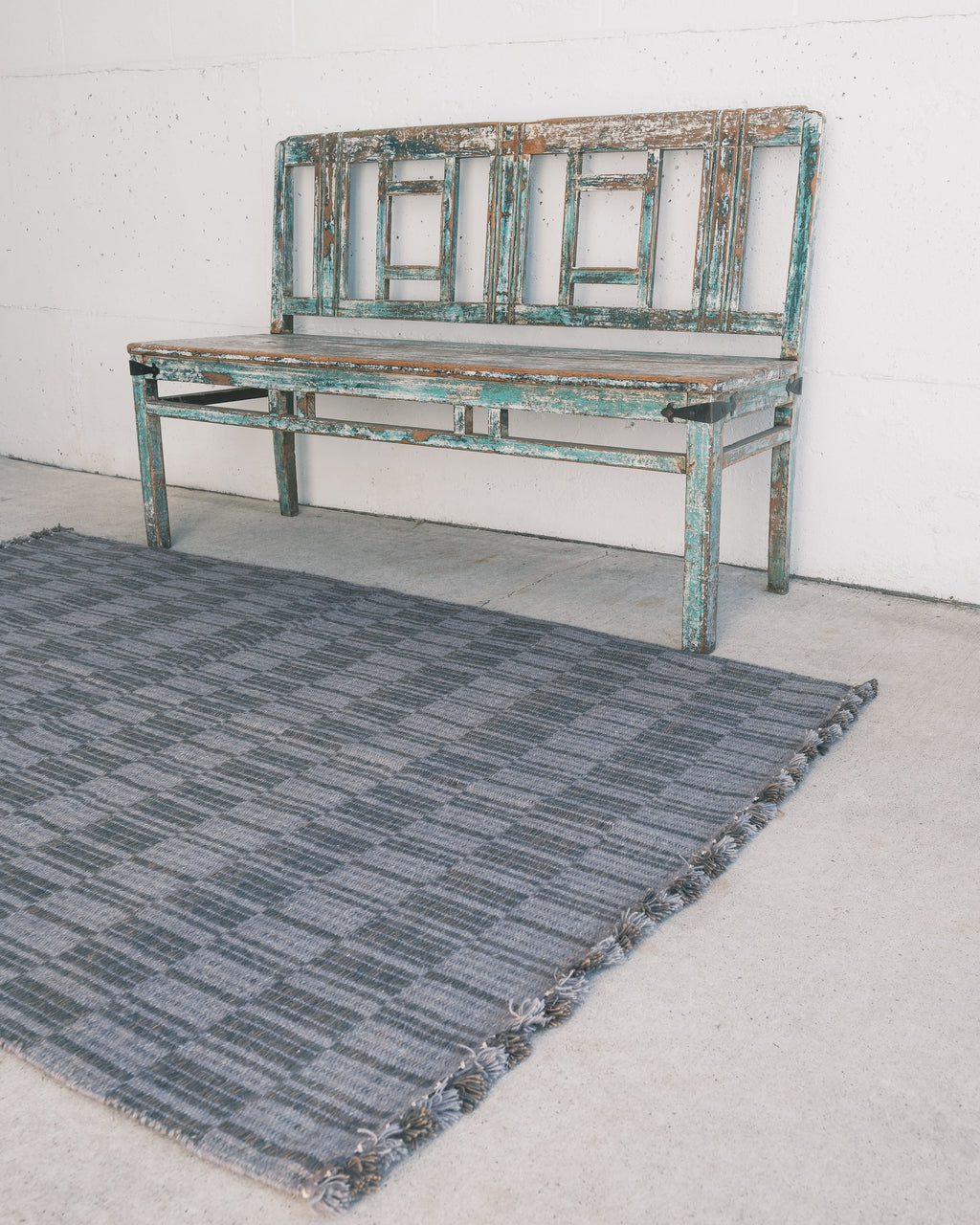 A handwoven wool carpet with a sturdy cotton warp made by village artisans in Rajasthan, India. The natural fibres of the local desert sheep make these flat-weave rugs long lasting and durable.