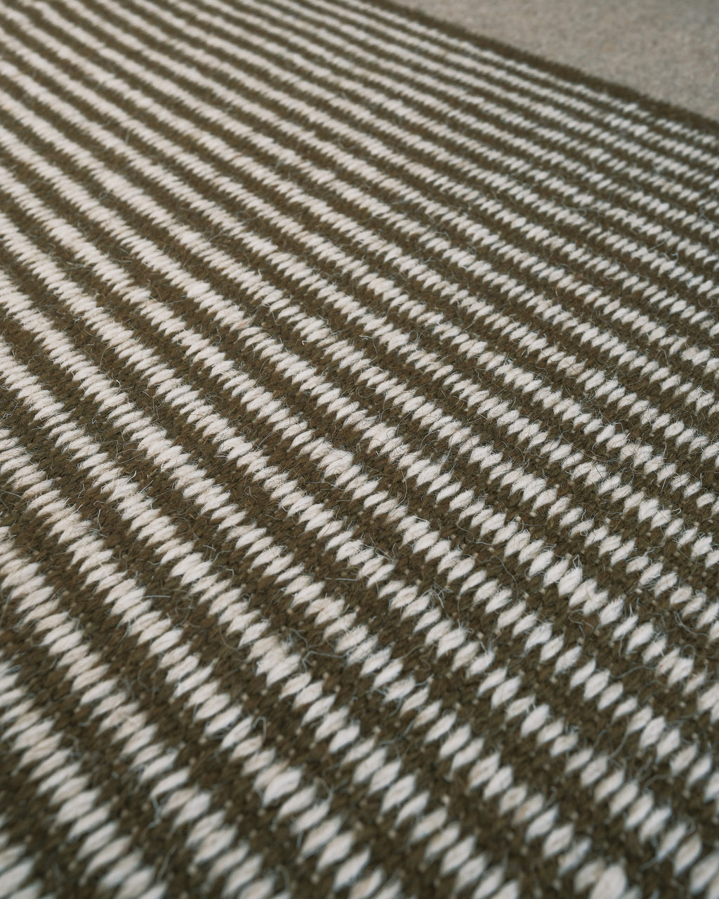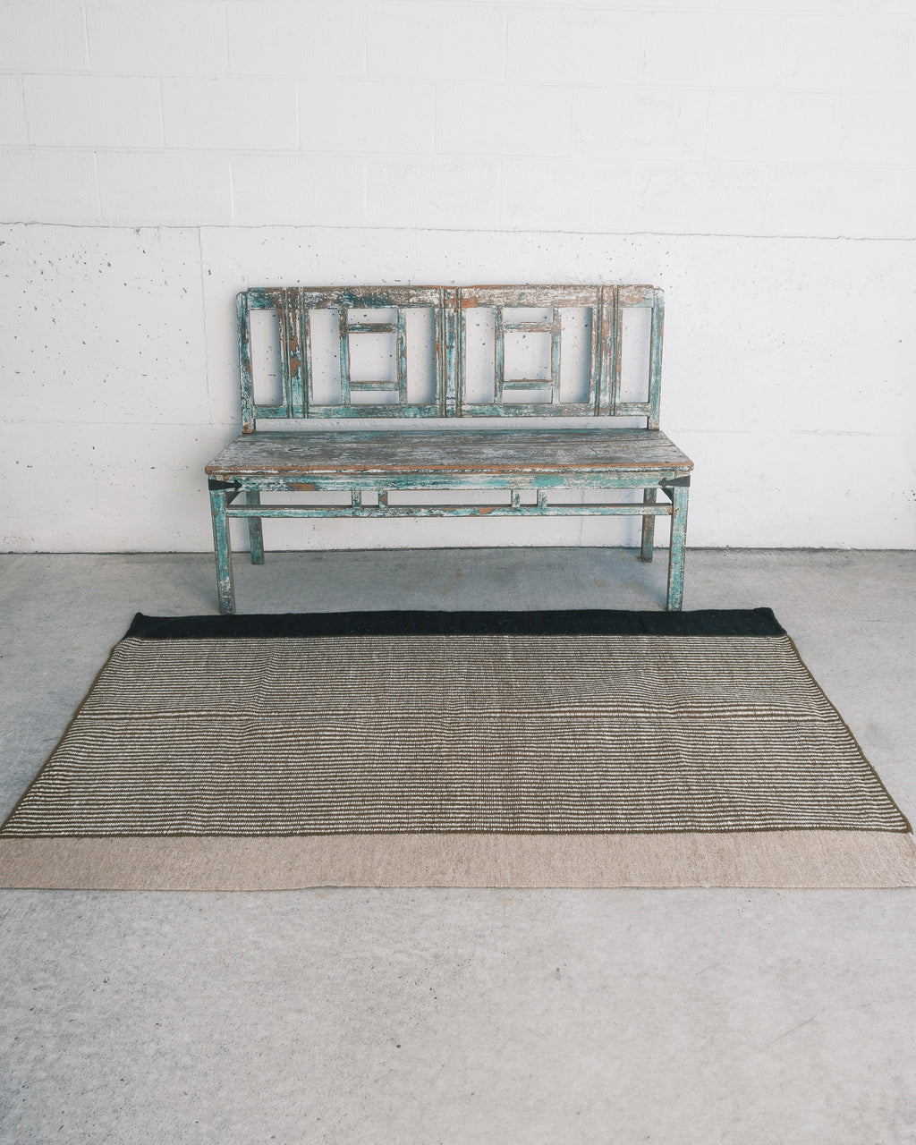 A handwoven wool carpet with a sturdy cotton warp made by village artisans in Rajasthan, India. The natural fibres of the local desert sheep make these flat-weave rugs long lasting and durable.
