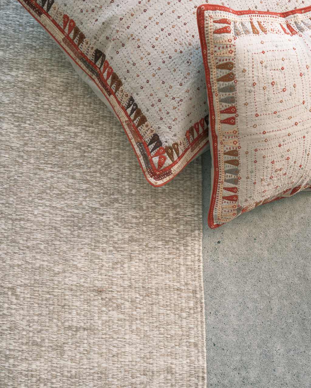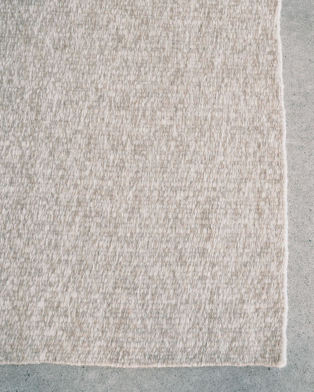 A handwoven wool carpet with a sturdy cotton warp made by village artisans in Rajasthan, India. The natural fibres of the local desert sheep make these flat-weave rugs long lasting and durable.