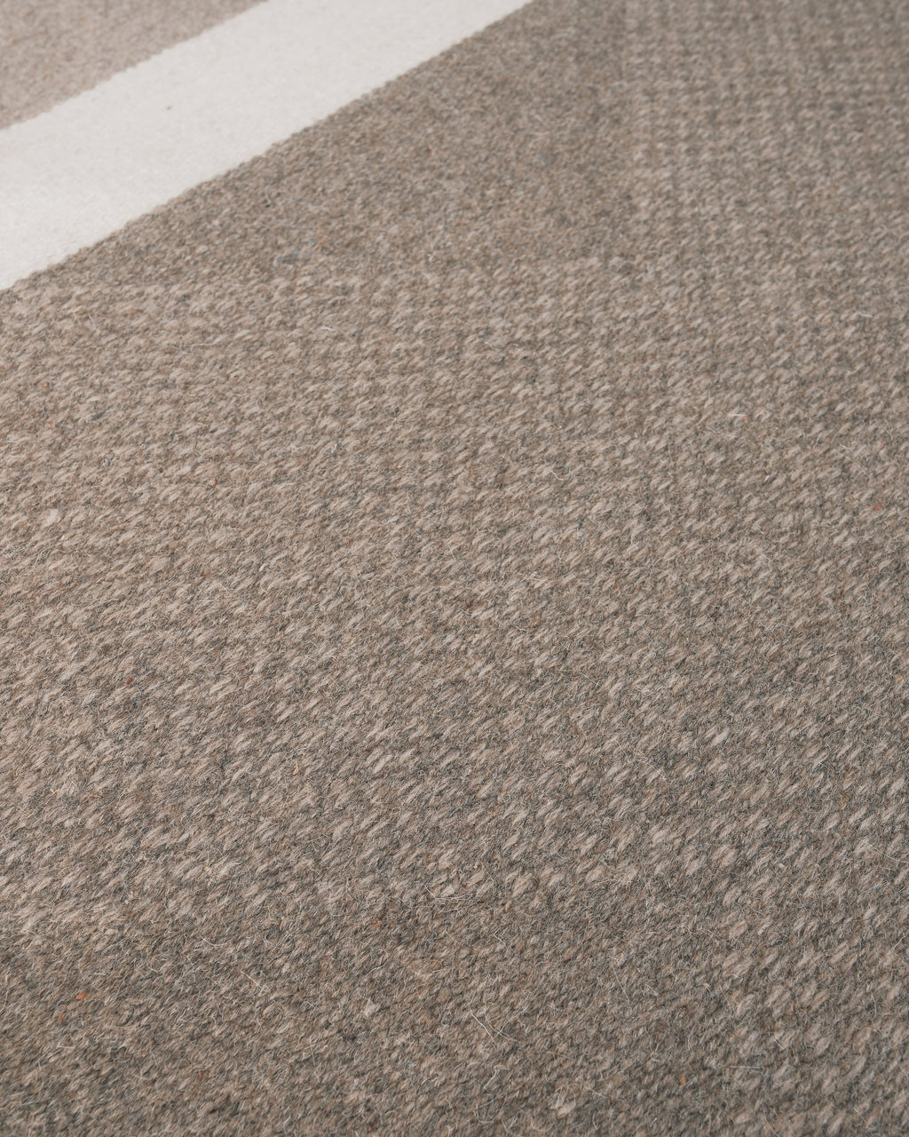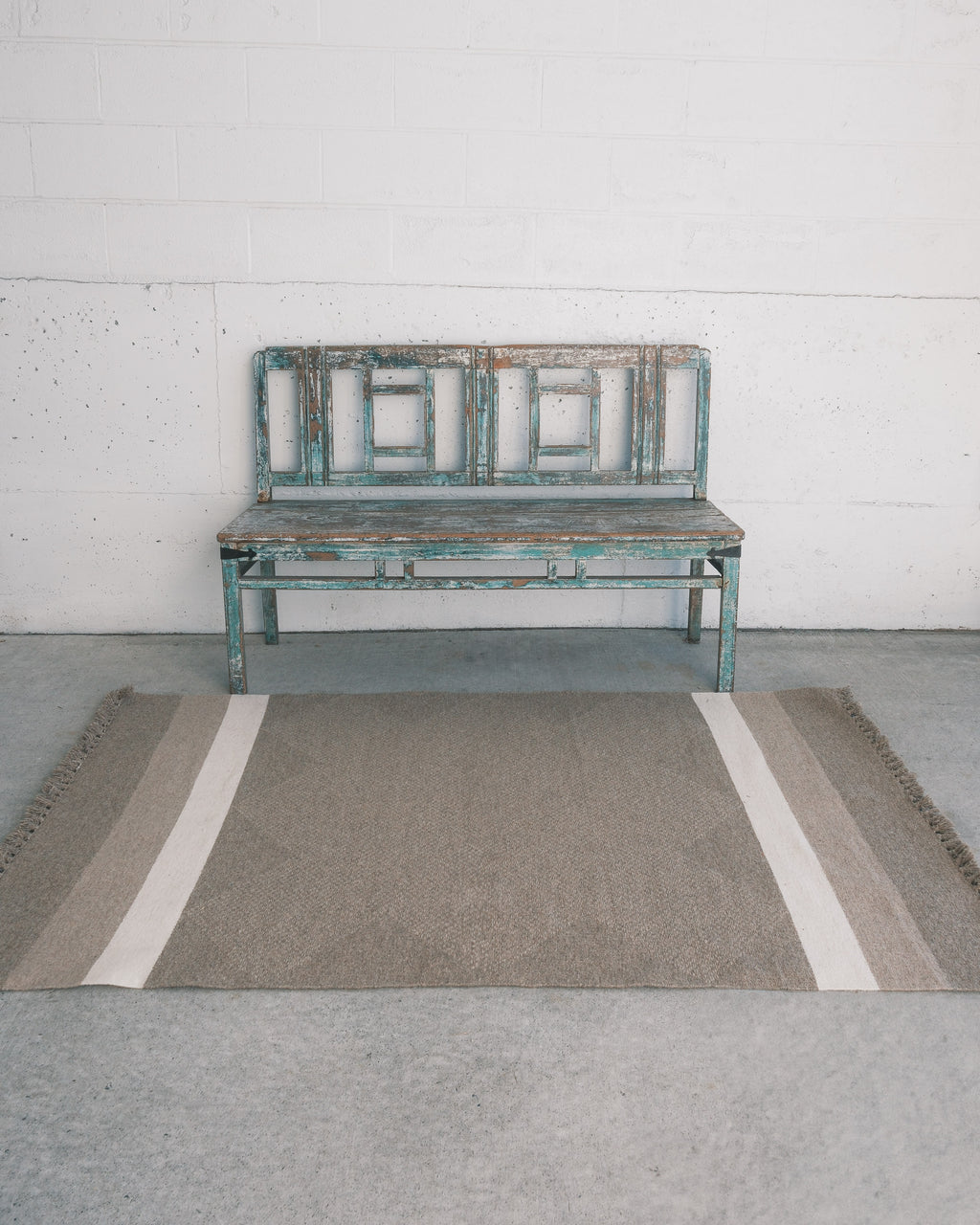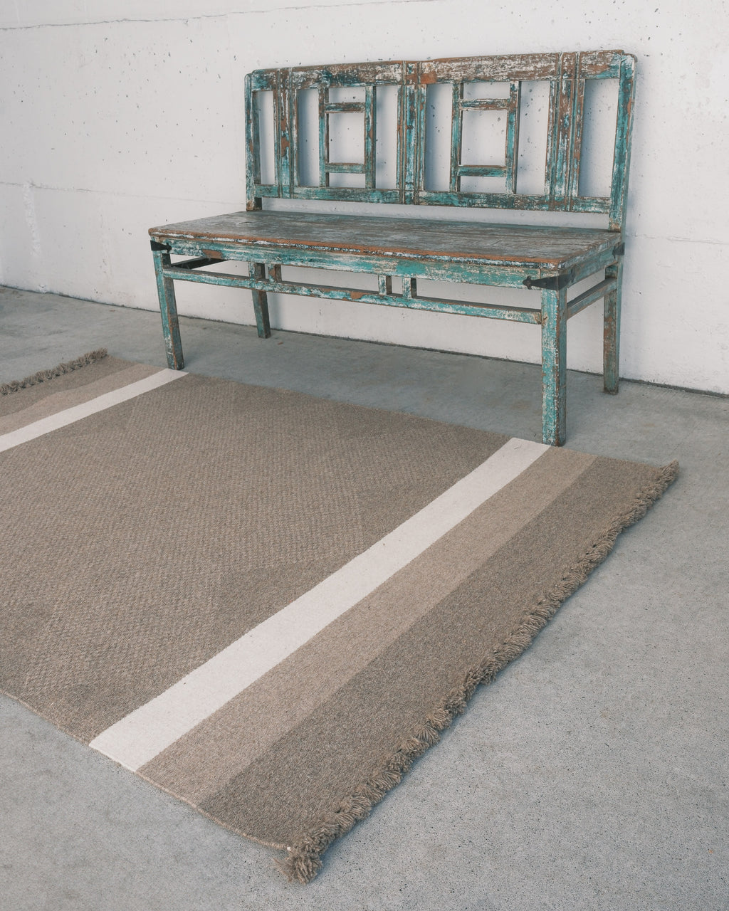 A handwoven wool carpet with a sturdy cotton warp made by village artisans in Rajasthan, India. The natural fibres of the local desert sheep make these flat-weave rugs long lasting and durable.
