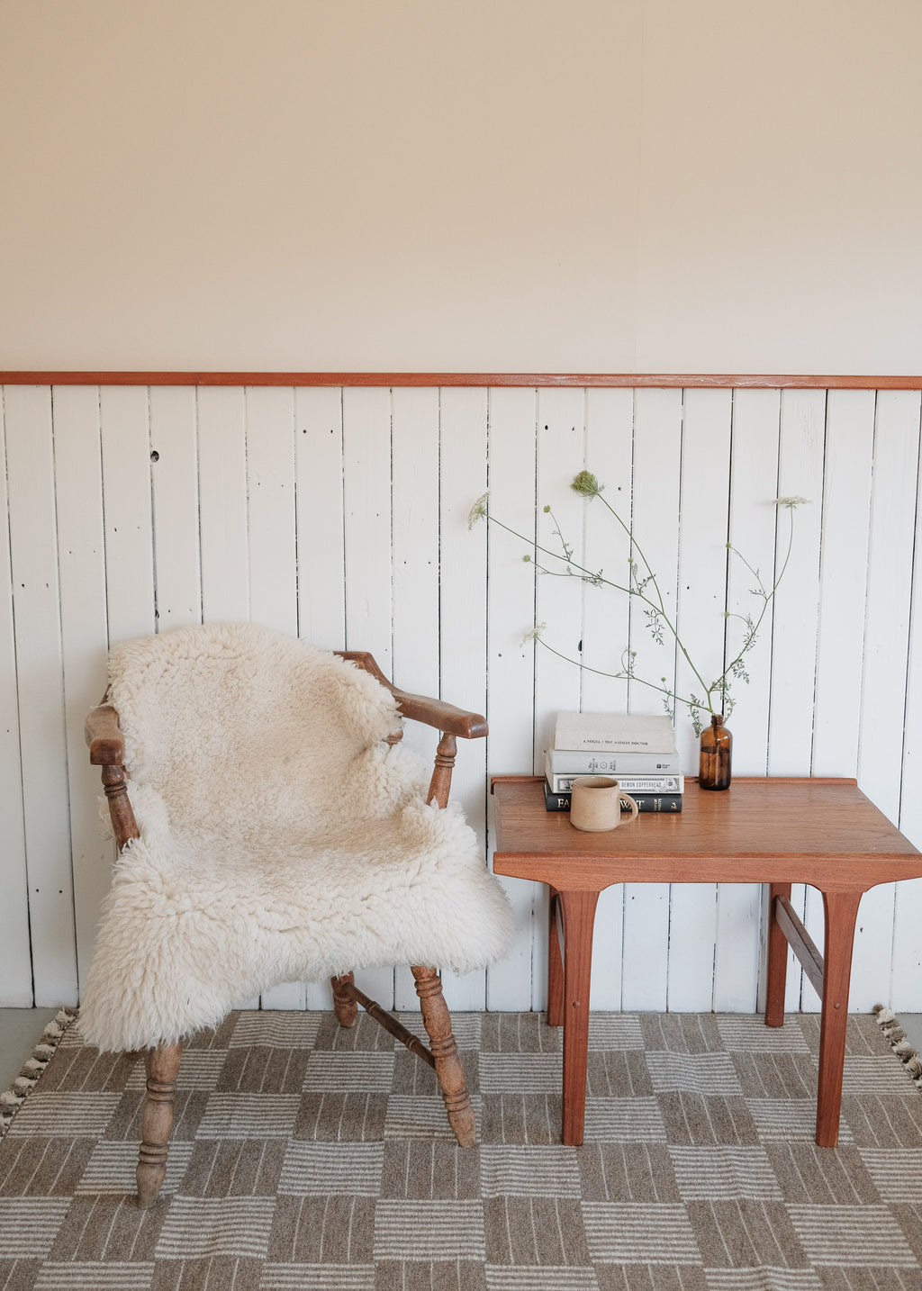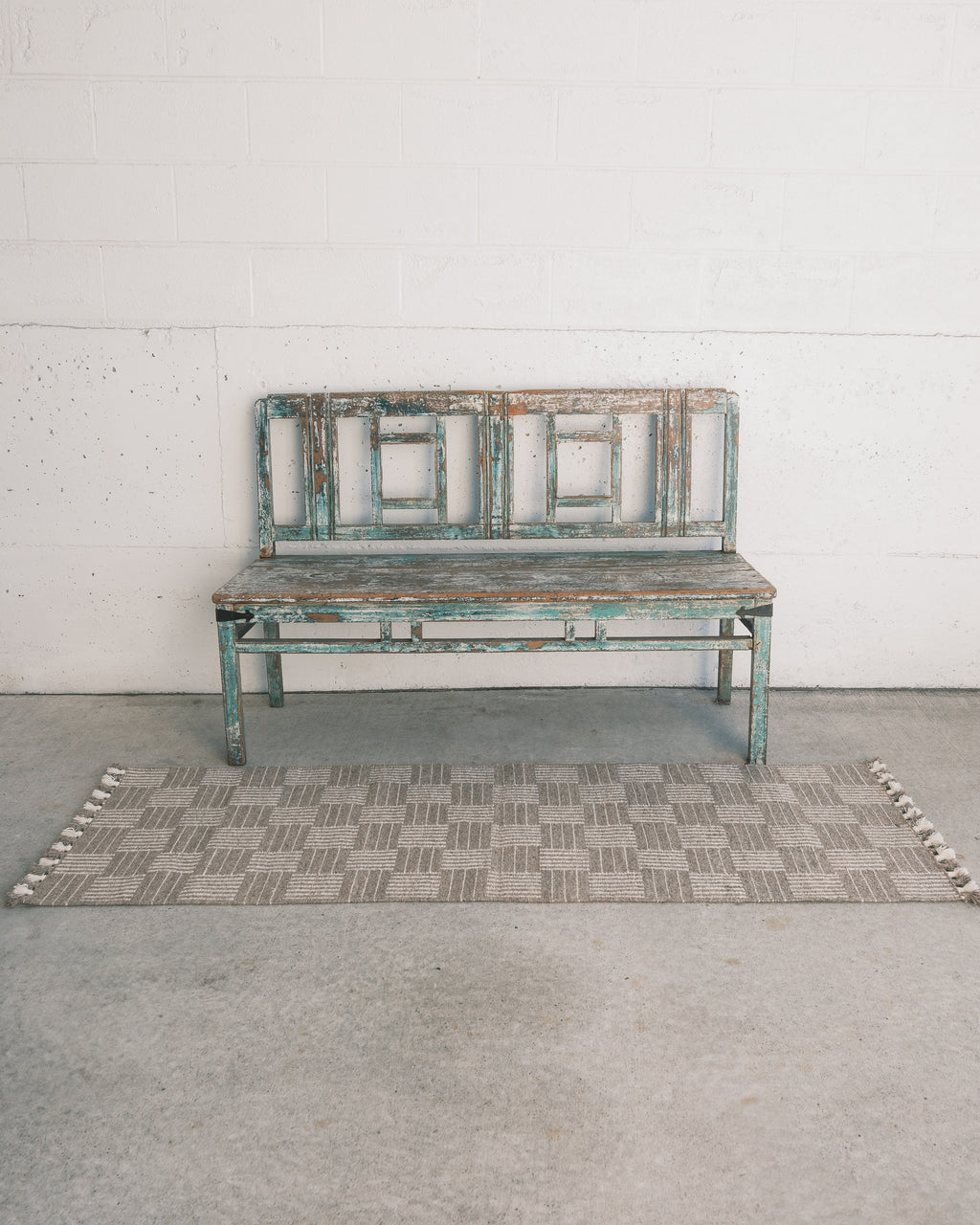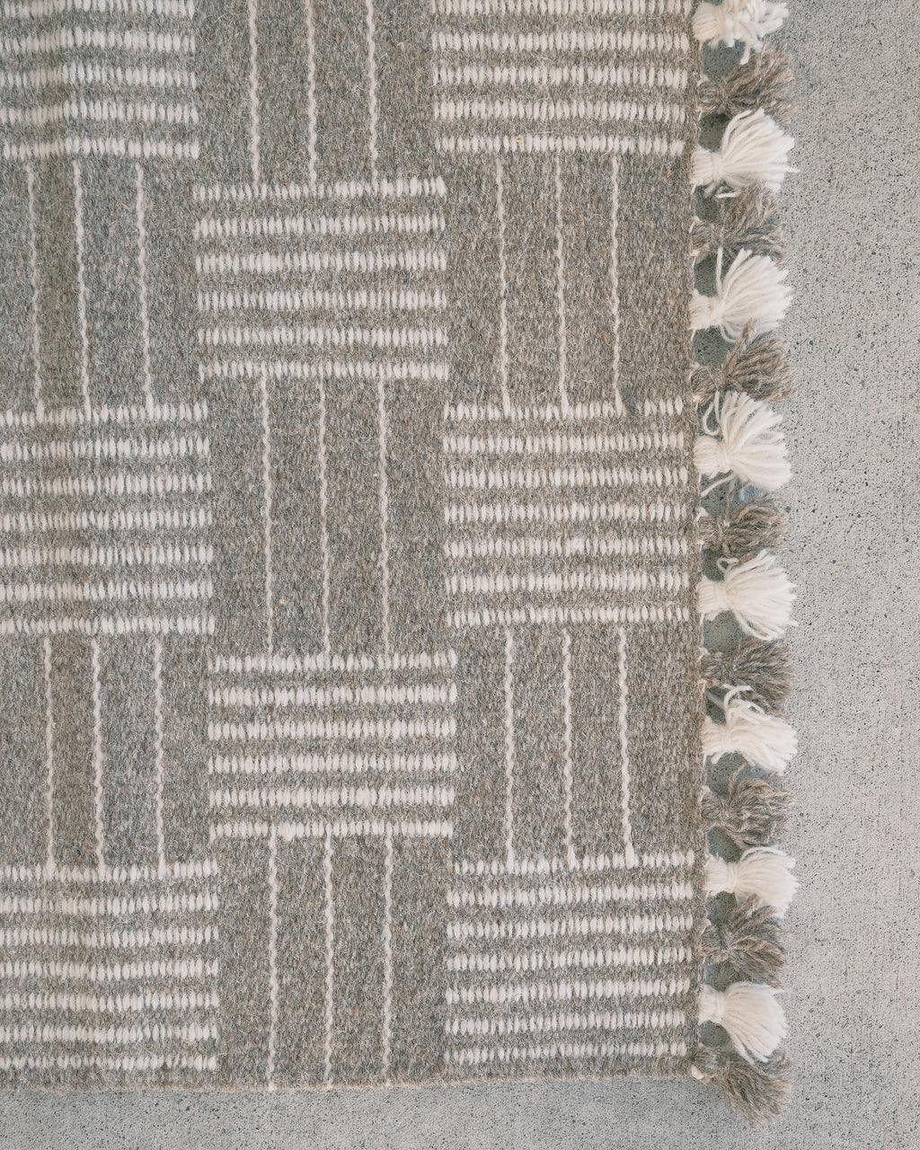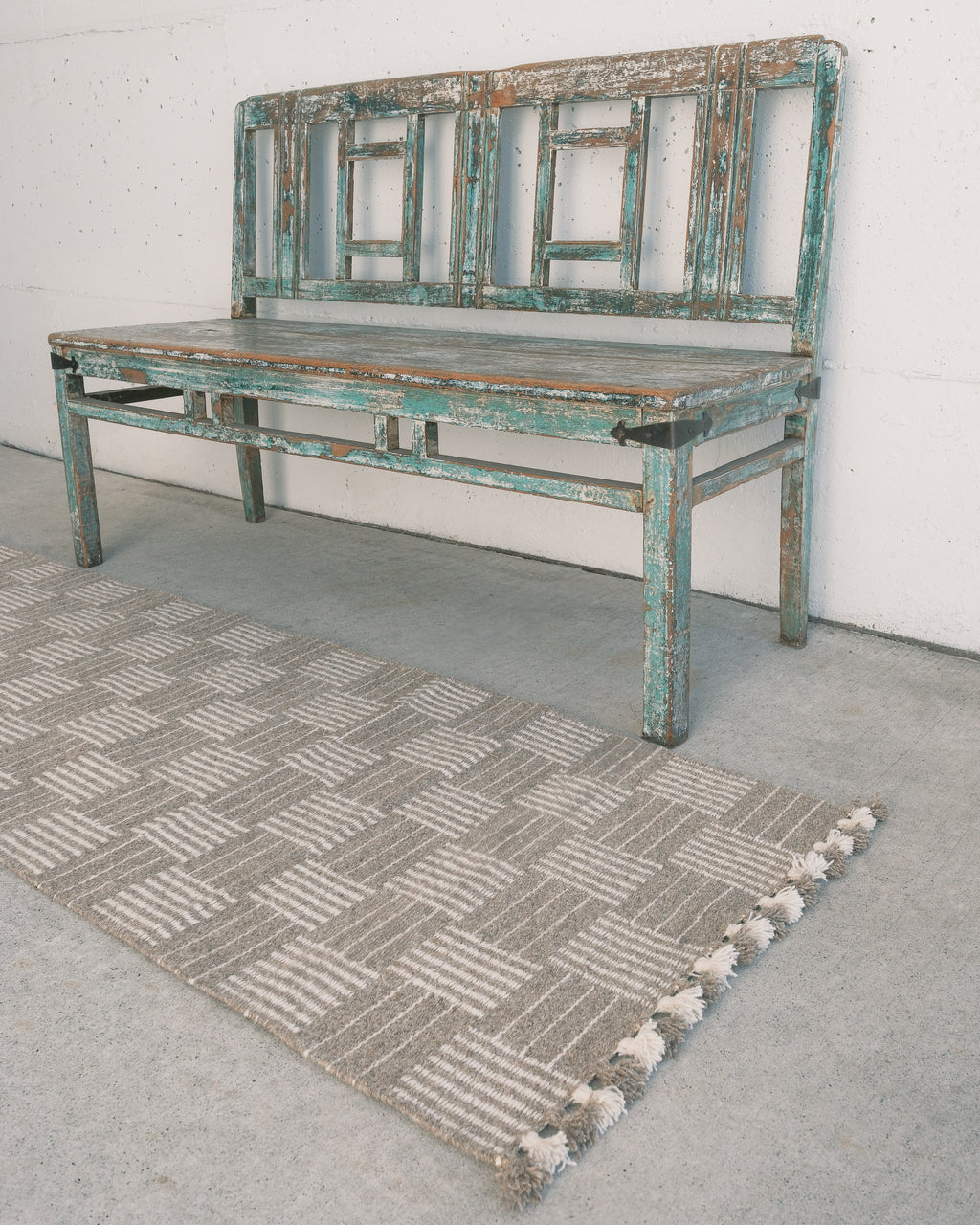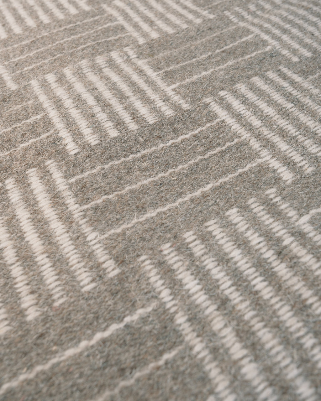 A handwoven wool carpet with a sturdy cotton warp made by village artisans in Rajasthan, India. The natural fibres of the local desert sheep make these flat-weave rugs long lasting and durable.