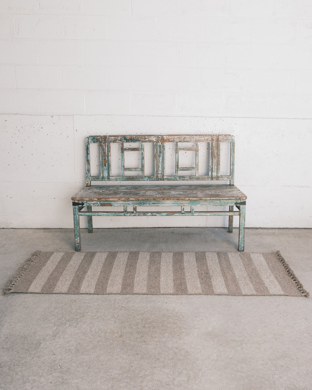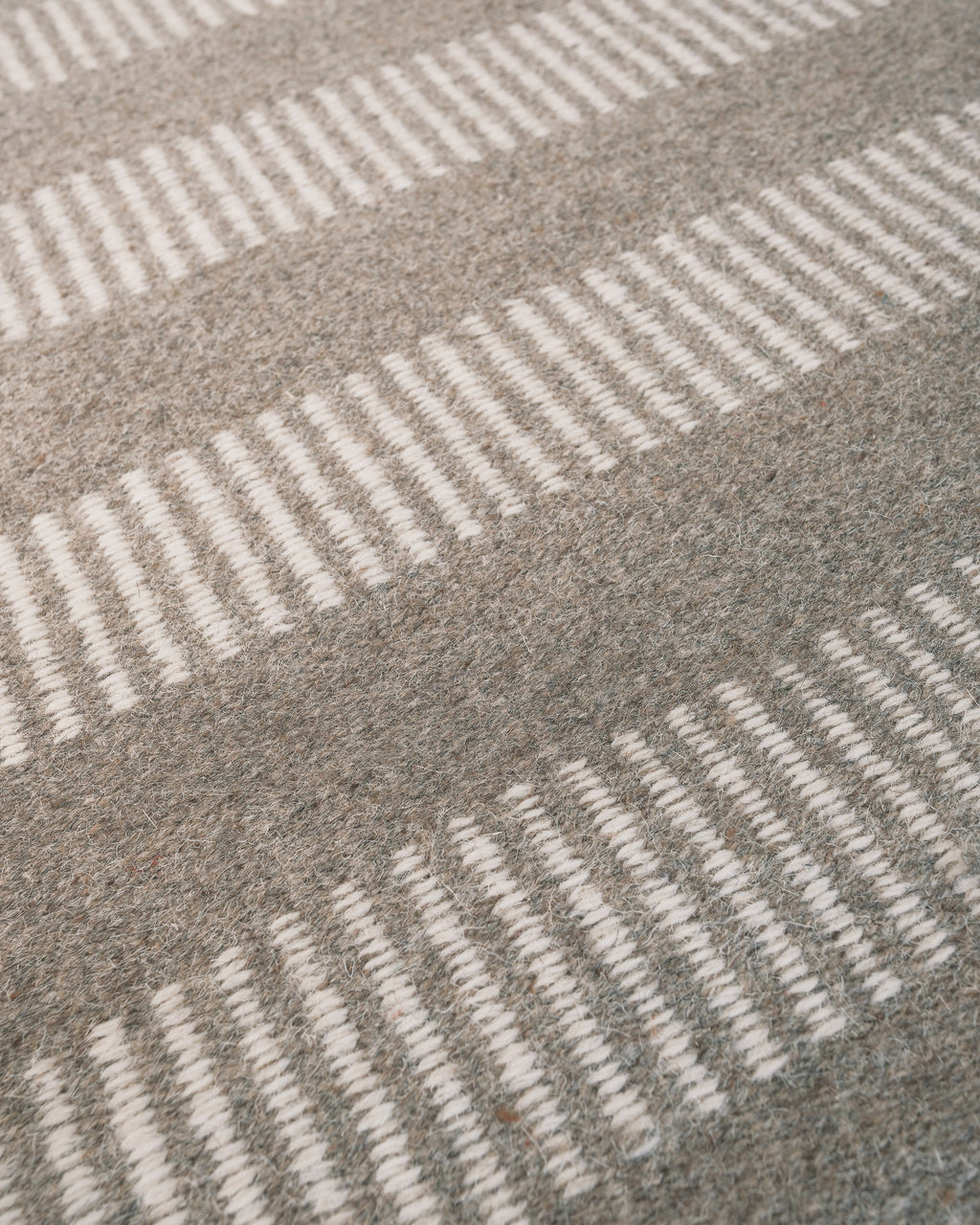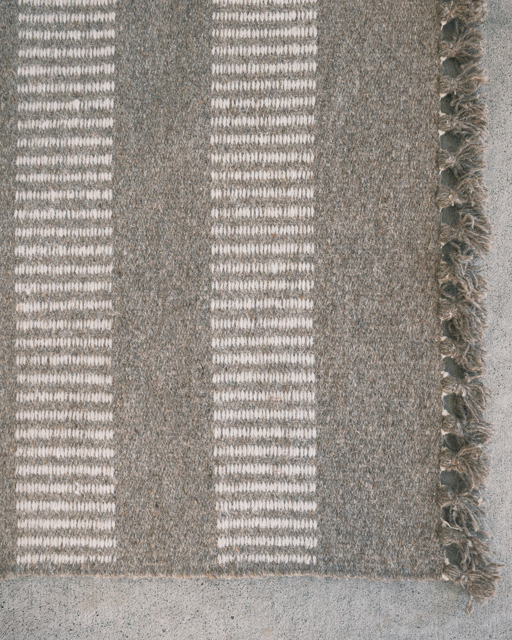 A handwoven wool carpet with a sturdy cotton warp made by village artisans in Rajasthan, India. The natural fibres of the local desert sheep make these flat-weave rugs long lasting and durable.