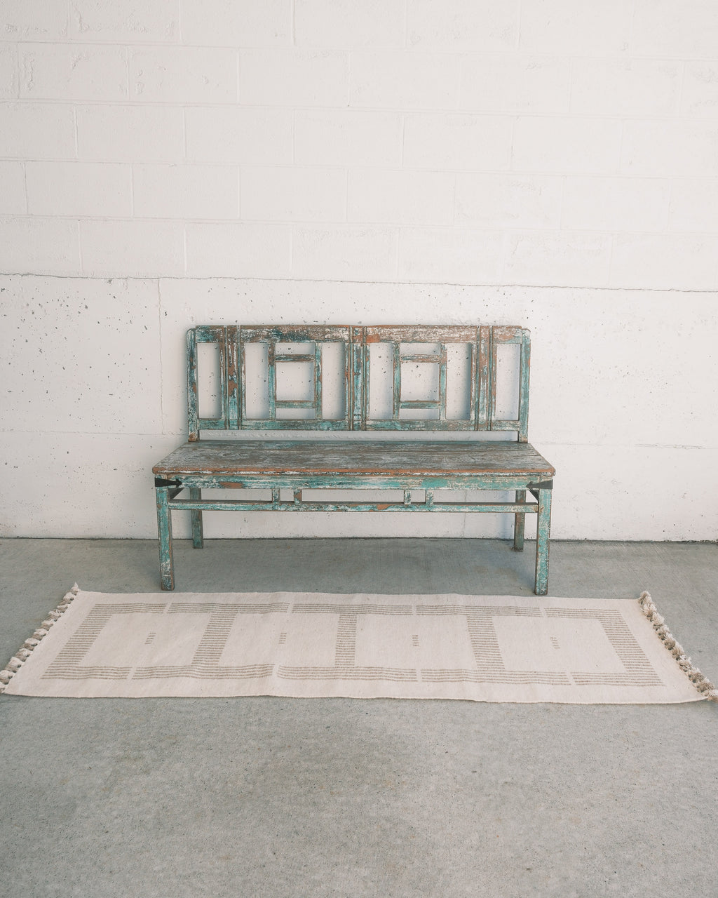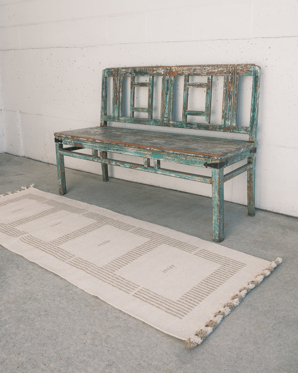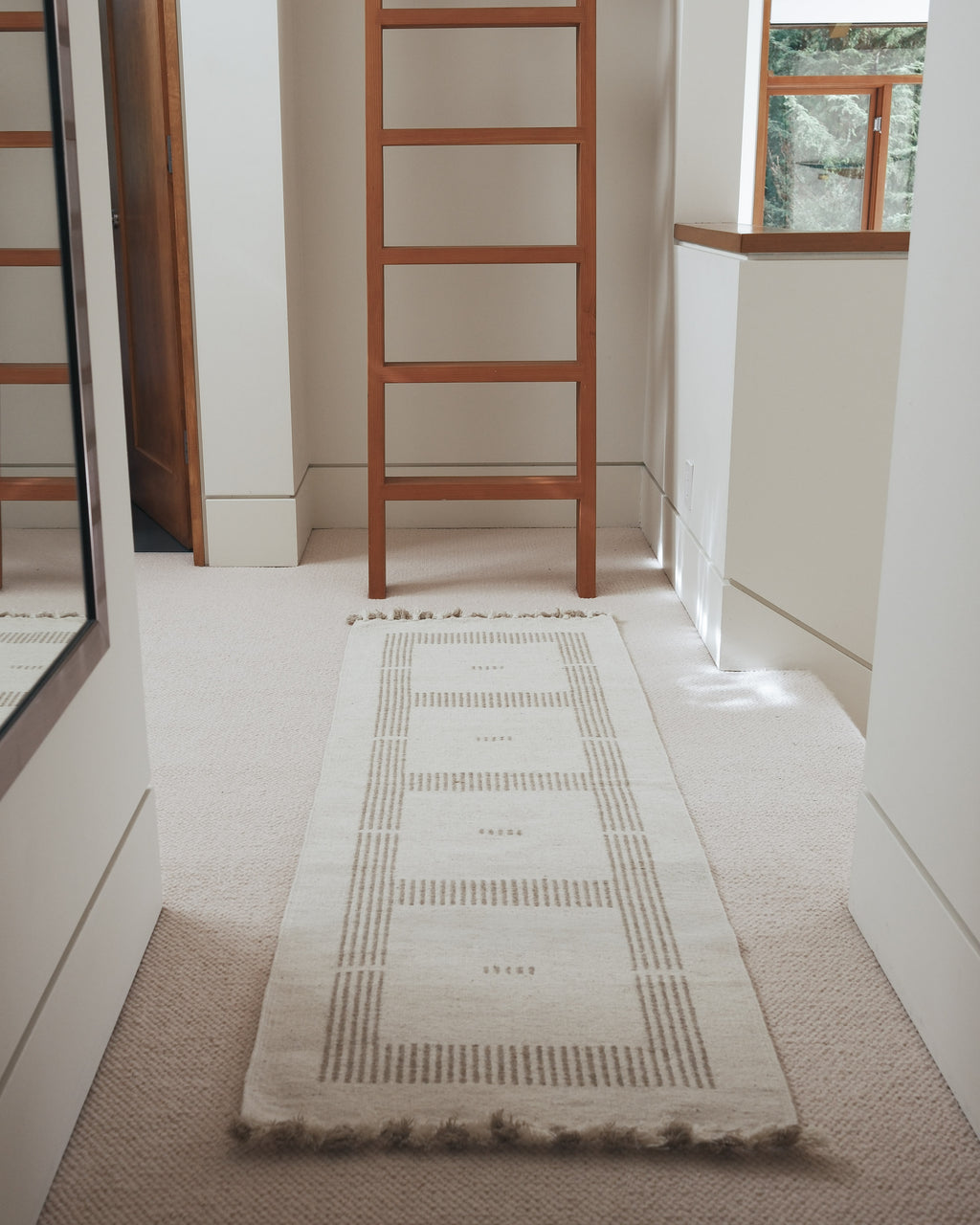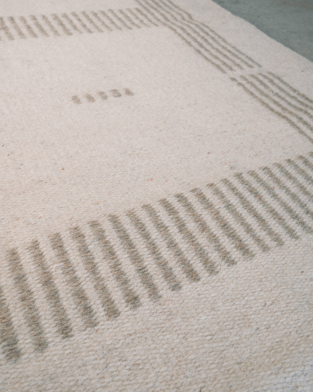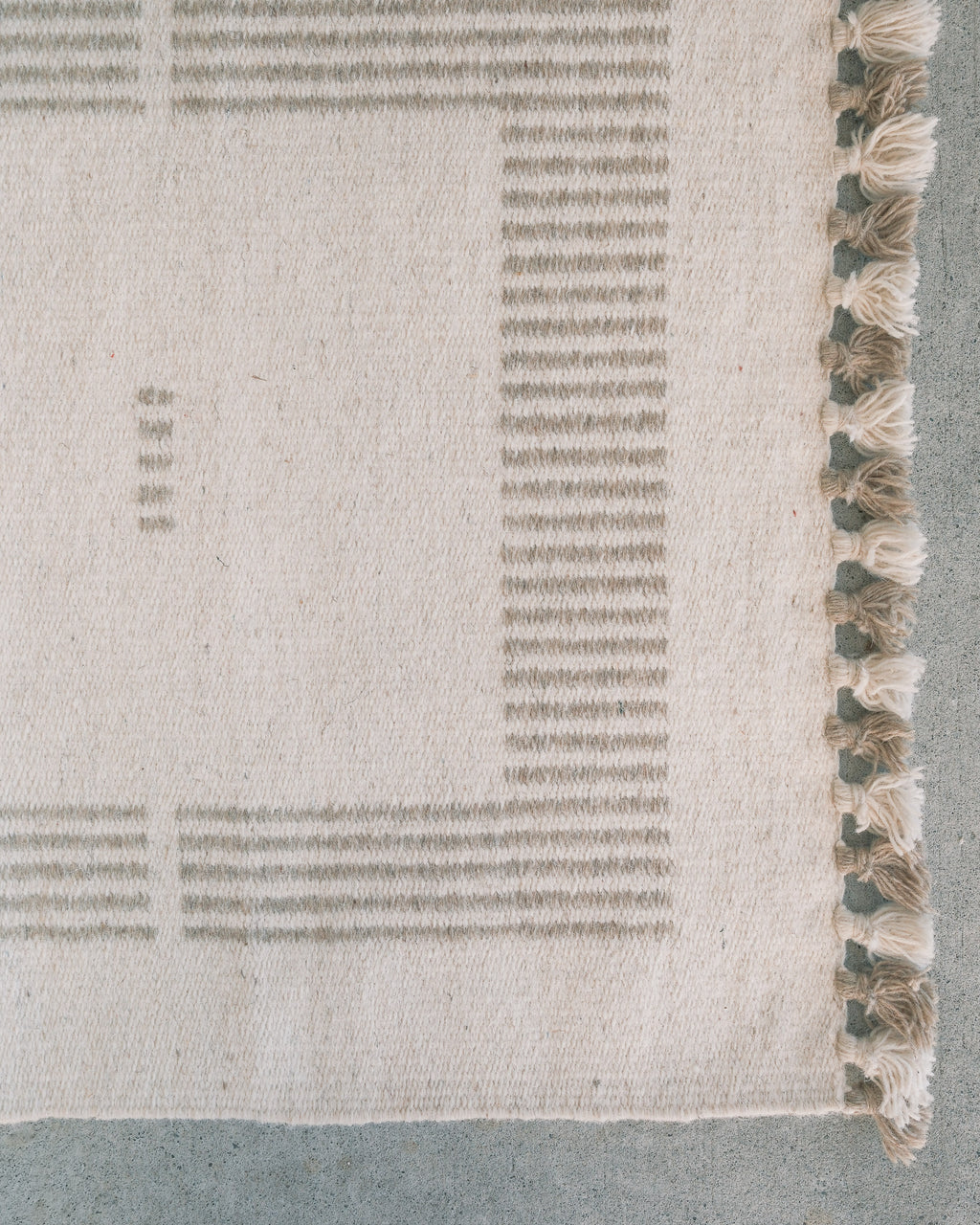 A handwoven wool carpet with a sturdy cotton warp made by village artisans in Rajasthan, India. The natural fibres of the local desert sheep make these flat-weave rugs long lasting and durable.