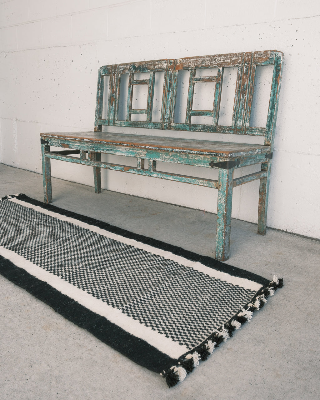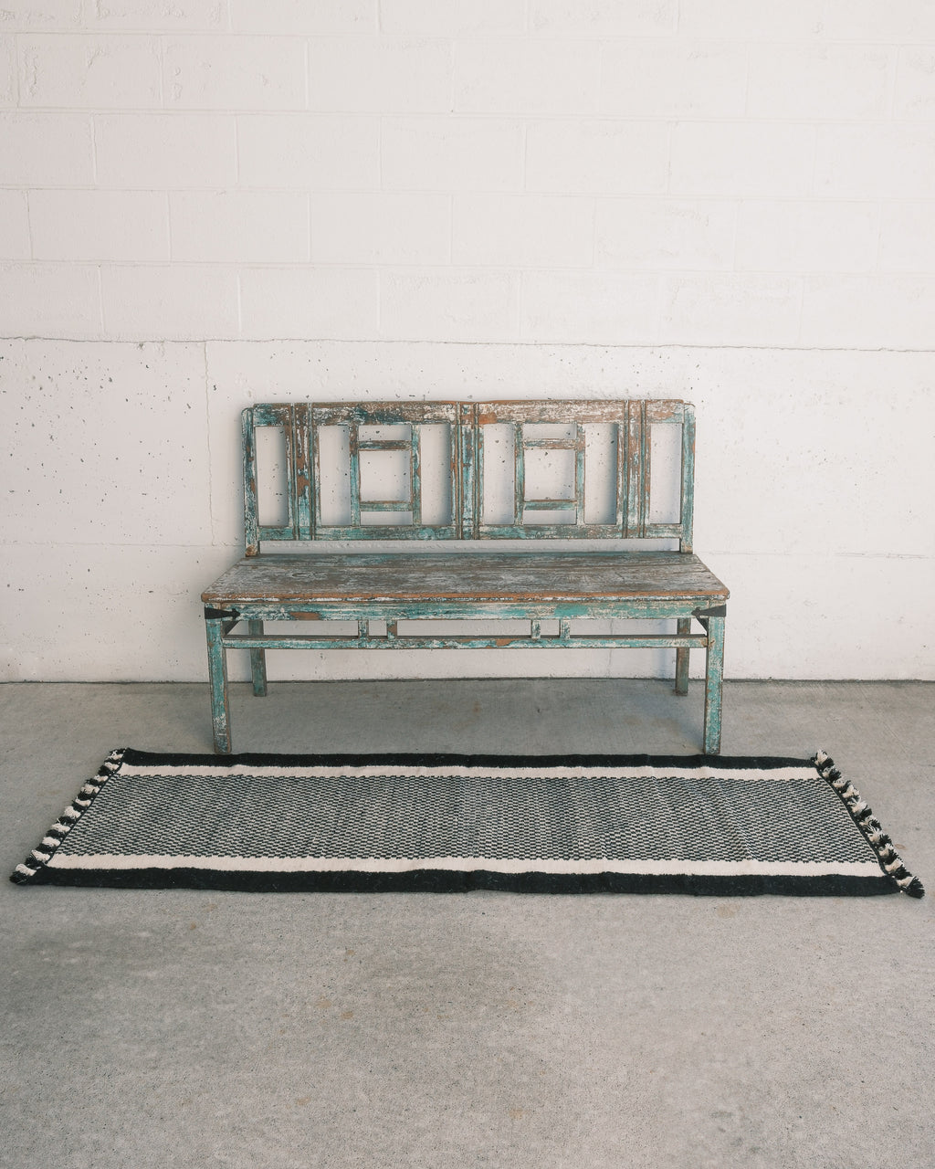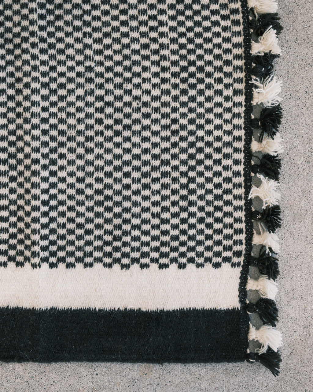A handwoven wool carpet with a sturdy cotton warp made by village artisans in Rajasthan, India. The natural fibres of the local desert sheep make these flat-weave rugs long lasting and durable.